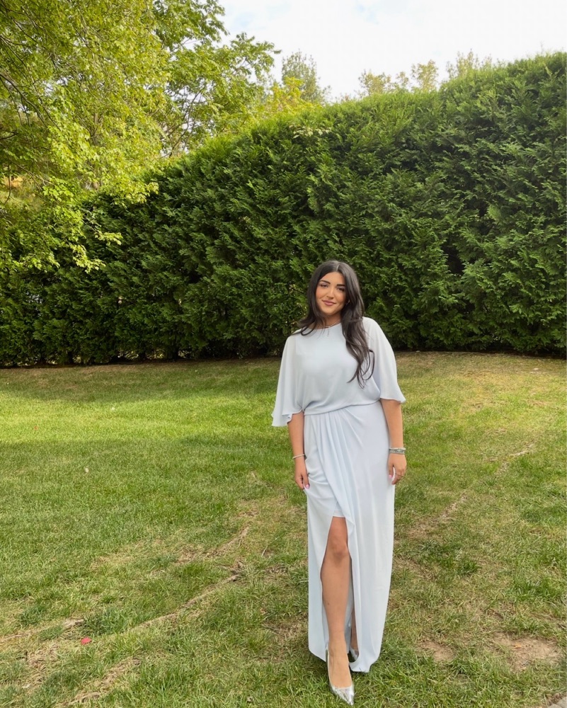 Baby blue gown perfect for black tie wedding guest or bridesmaid look. Featuring flutter sleeves and high-low length.