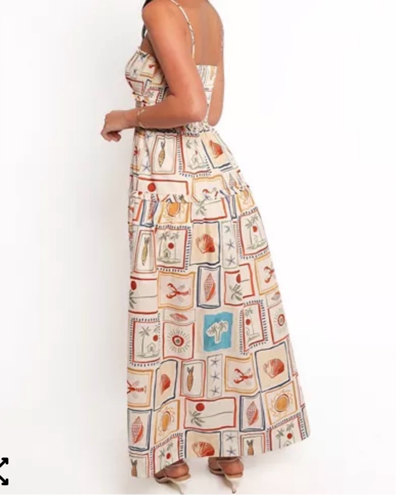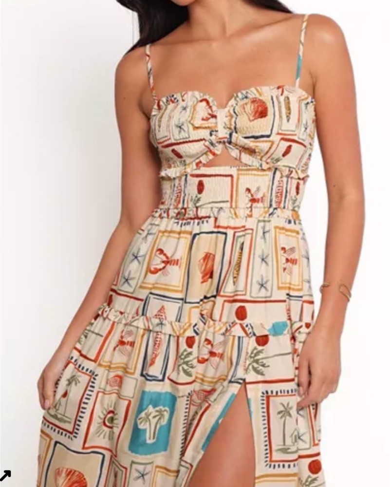 This striking maxi dress is the perfect piece for a summer vacation or outdoor event. The bold, colorful print adds a playful, eye-catching flair.