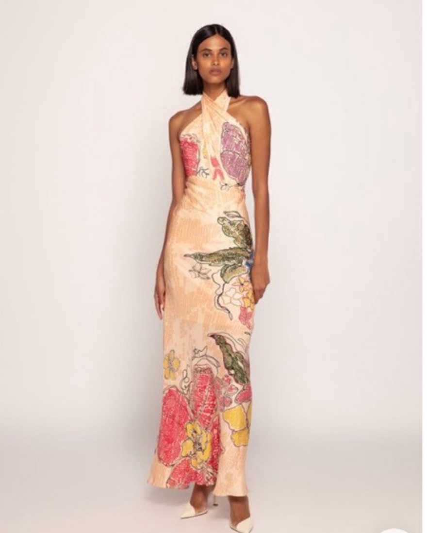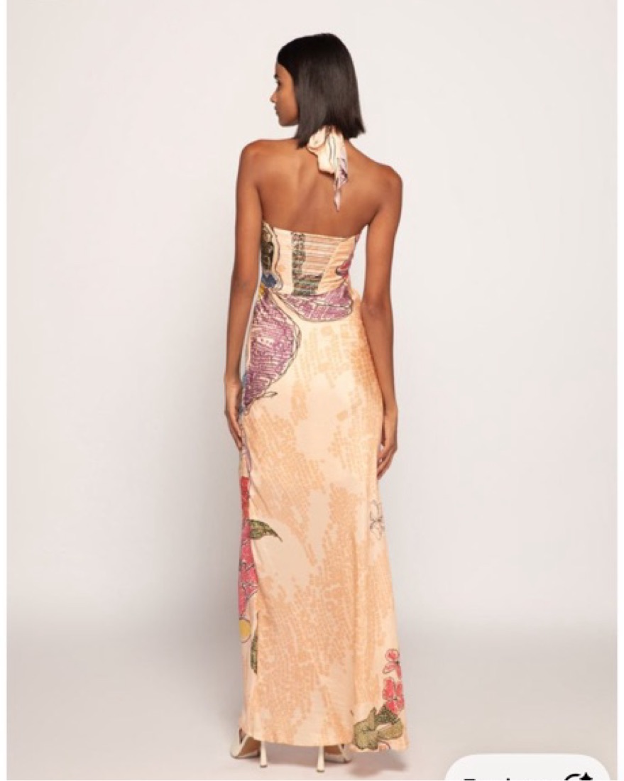 Frangipani Gown, size Medium but fits like a small. Halter dress, open back. Renter is responsible for dry cleaning if there is visible wear!