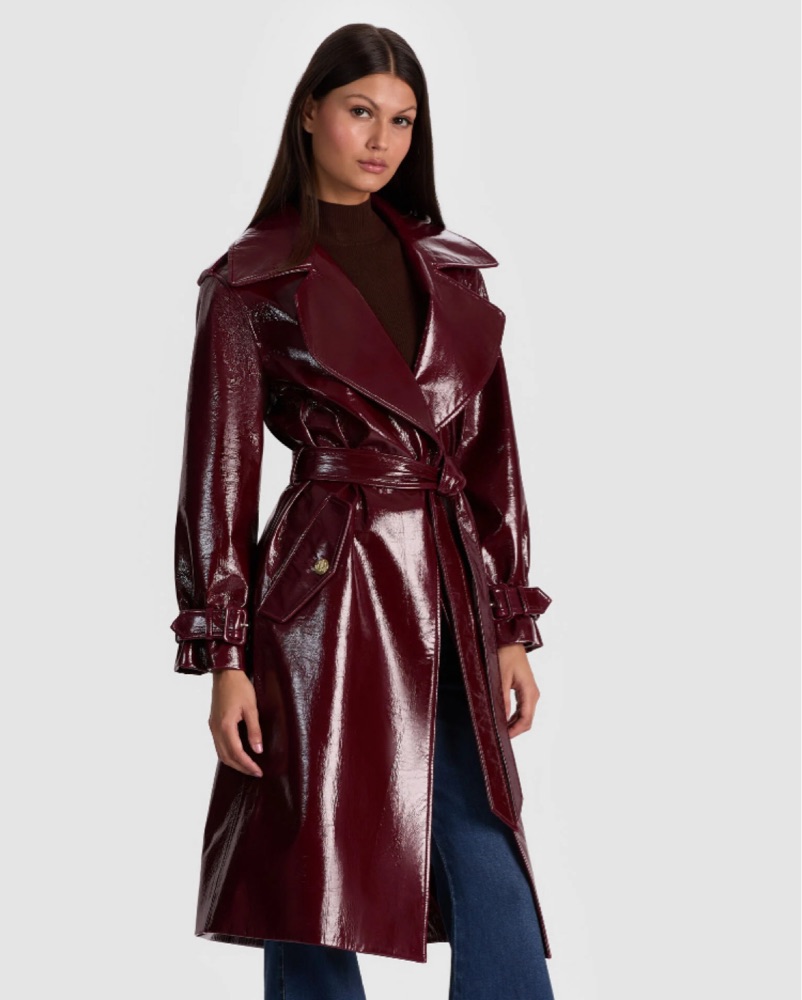 alice + olivia patent leather tie up trench coat in the color oxblood. Can be worn as a chic dress look or as a jacket