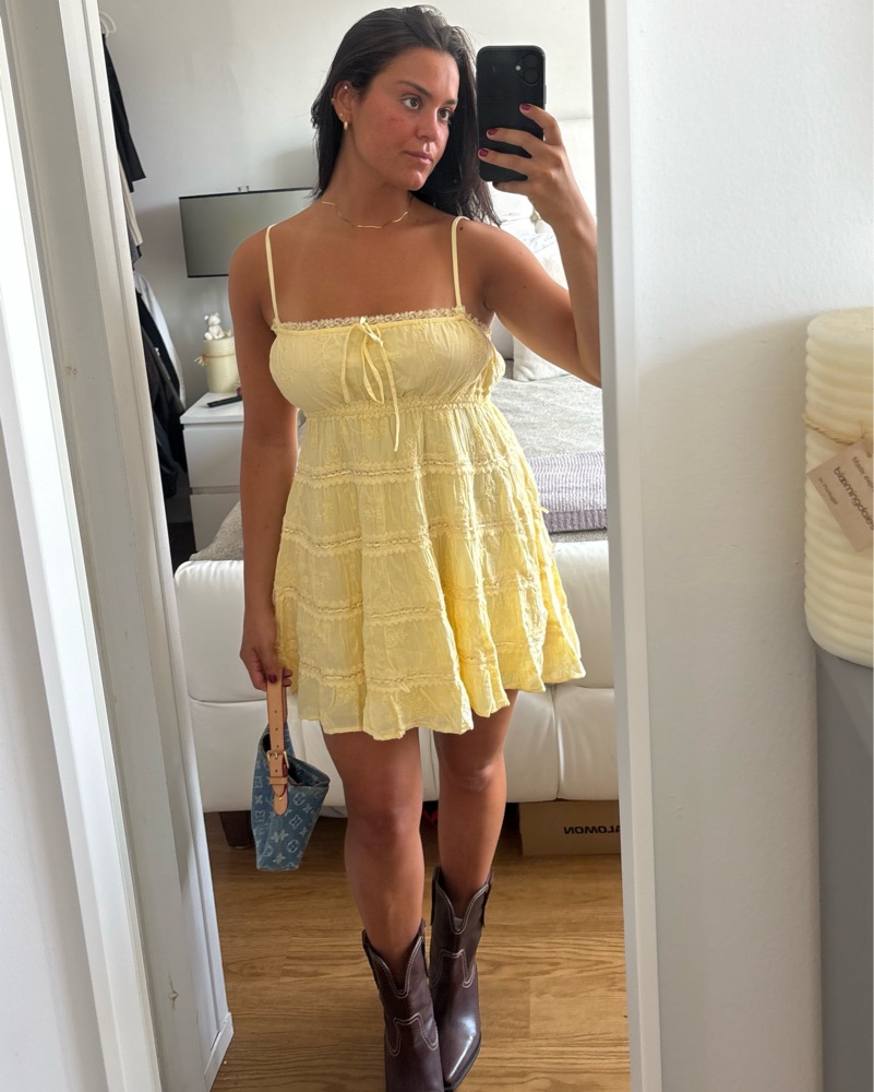 Floaty butter yellow dress with a small tie up tip. Adjustable straps and perfect for any occasion. Runs large I usually wear a medium and this is an XS