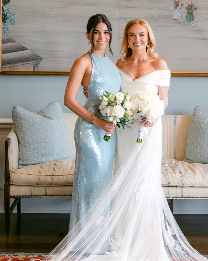Bec and Bridge high neck, low back sequin baby blue gown.