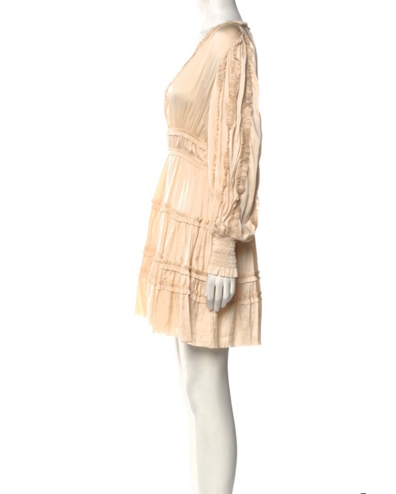 This elegant silk dress features billowing sleeves and a tiered skirt, creating a romantic, ethereal look. Suitable for a variety of occasions, from a garden party to a summer wedding. It’s a white/beige