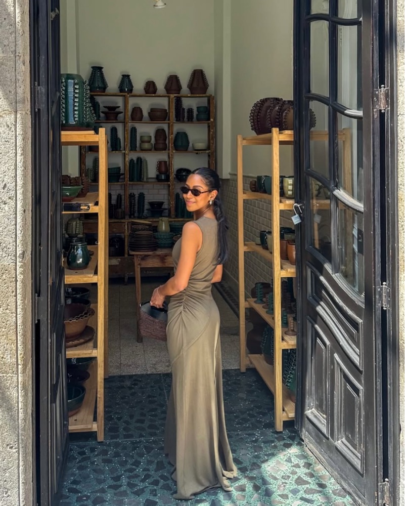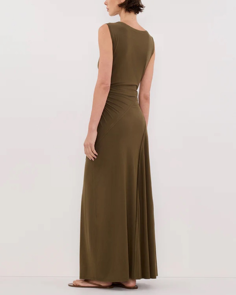 Olive green sleeveless dress with ruched detail