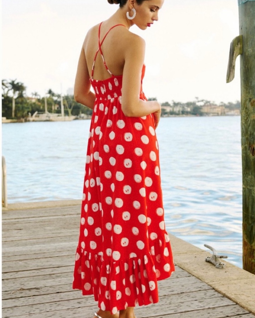 This captivating polka dot maxi dress exudes a playful yet sophisticated vibe, perfect for a summer evening on the beach.