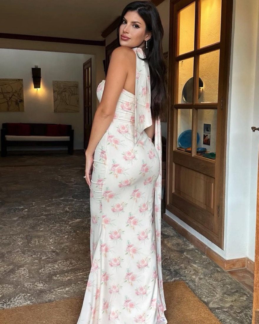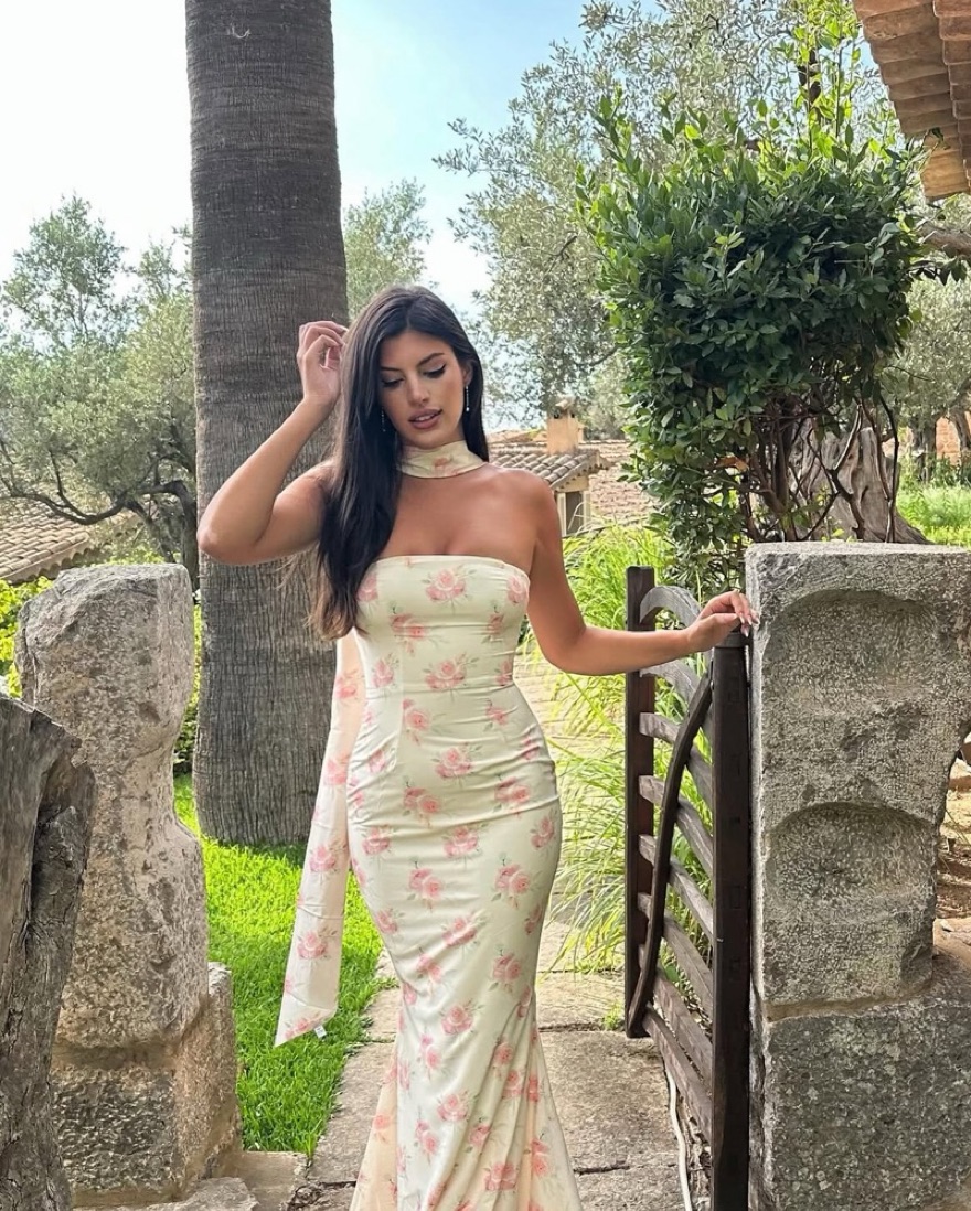 Scarf-Detail Strapless Gown in Large Rose Print. Extremely flattering and so elegant!