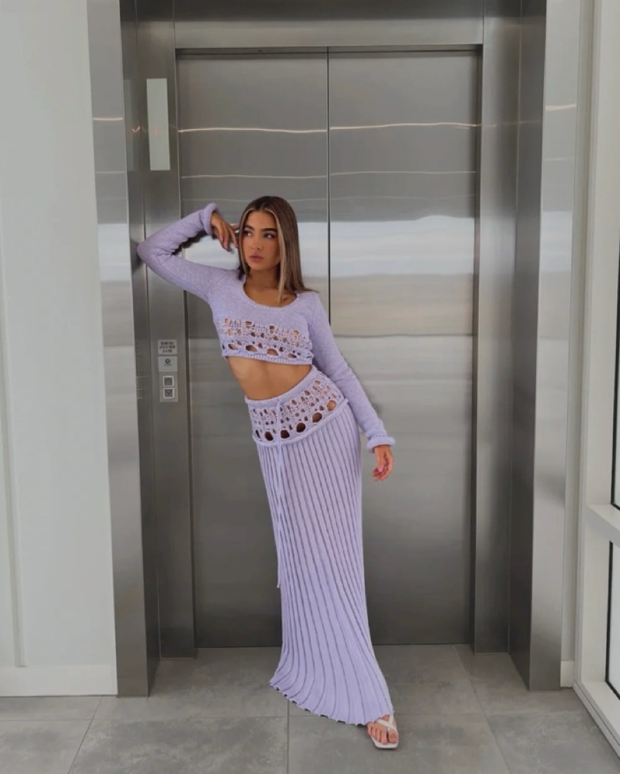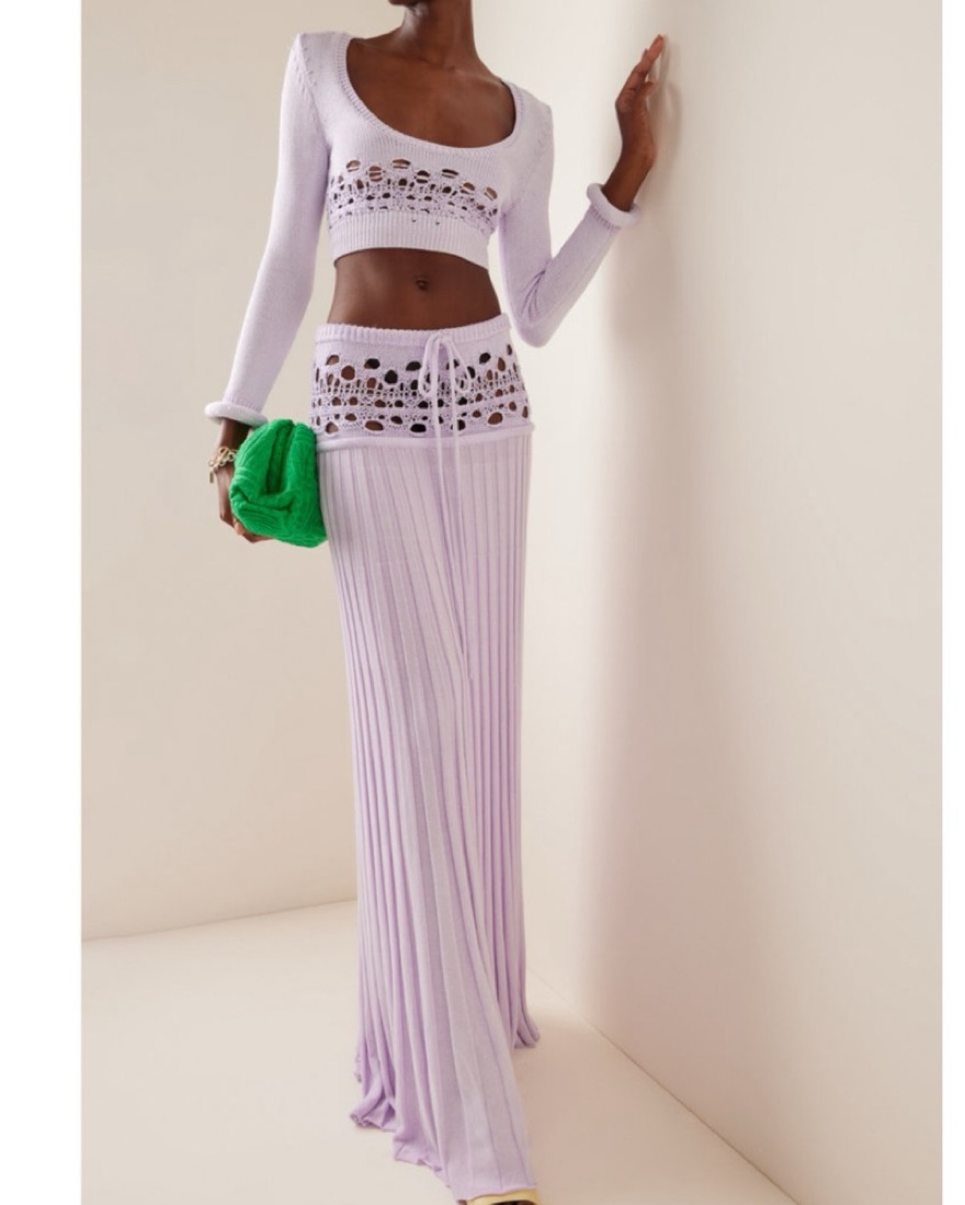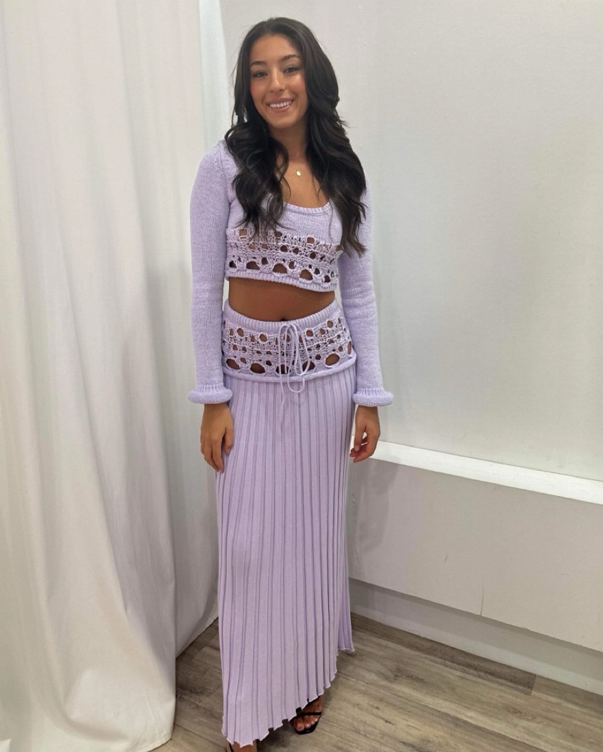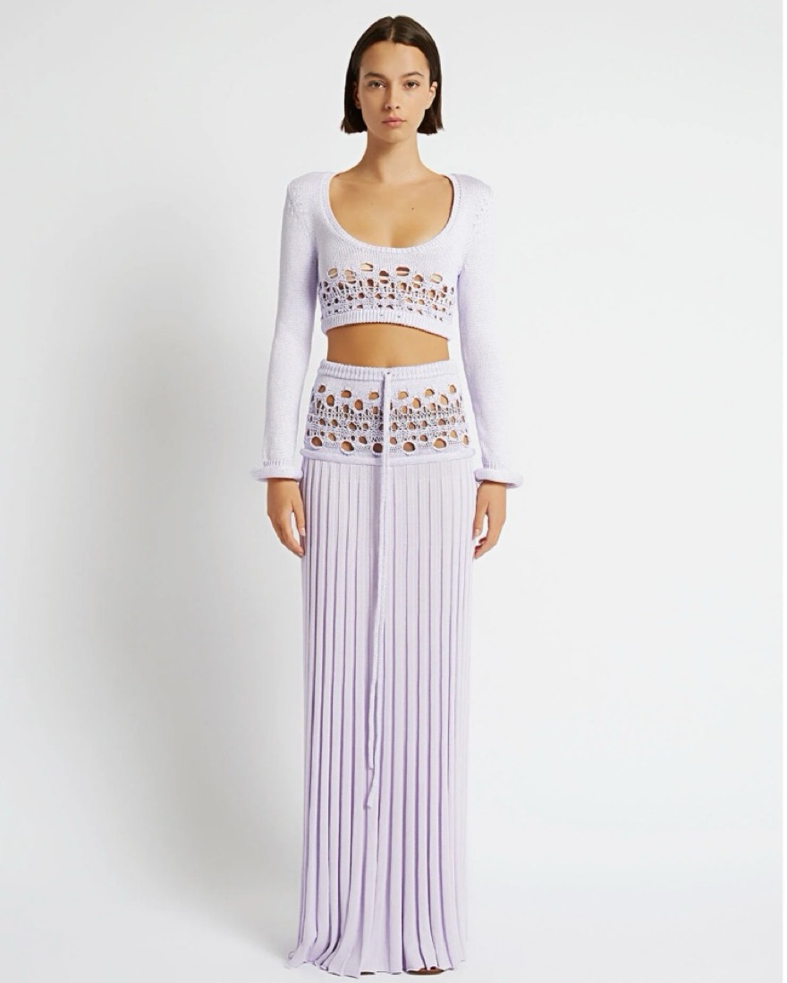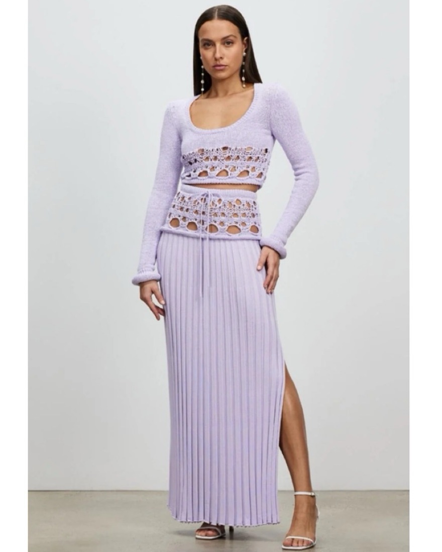 Christopher Esber crochet pleated matching top and skirt set in lilac. Long sleeve top is S and maxi skirt is XS. The skirt can fit an XS/S - im usually a size 4/6/28 for bottoms.