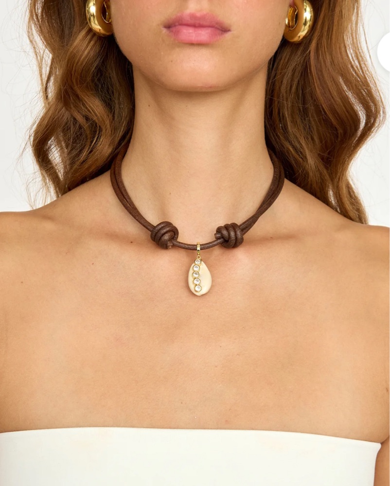Beach necklace. Leather rope. Seashell & diamonds