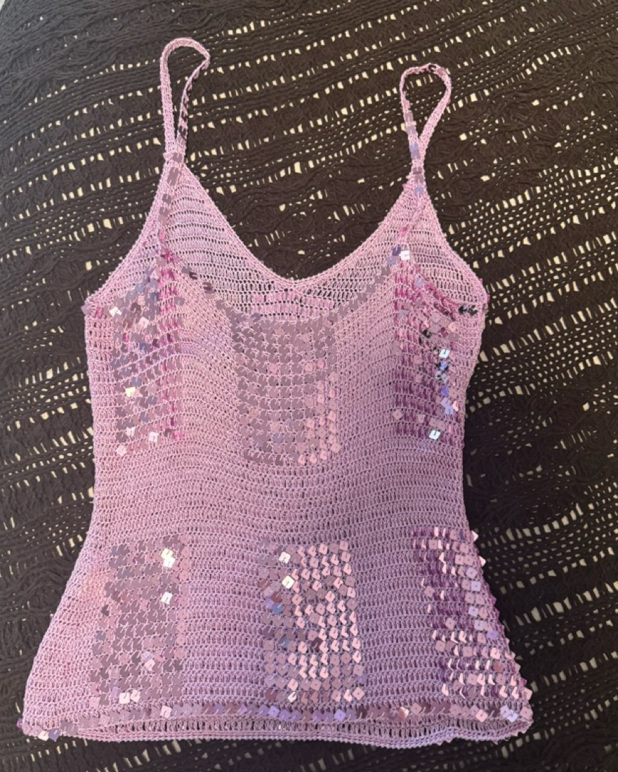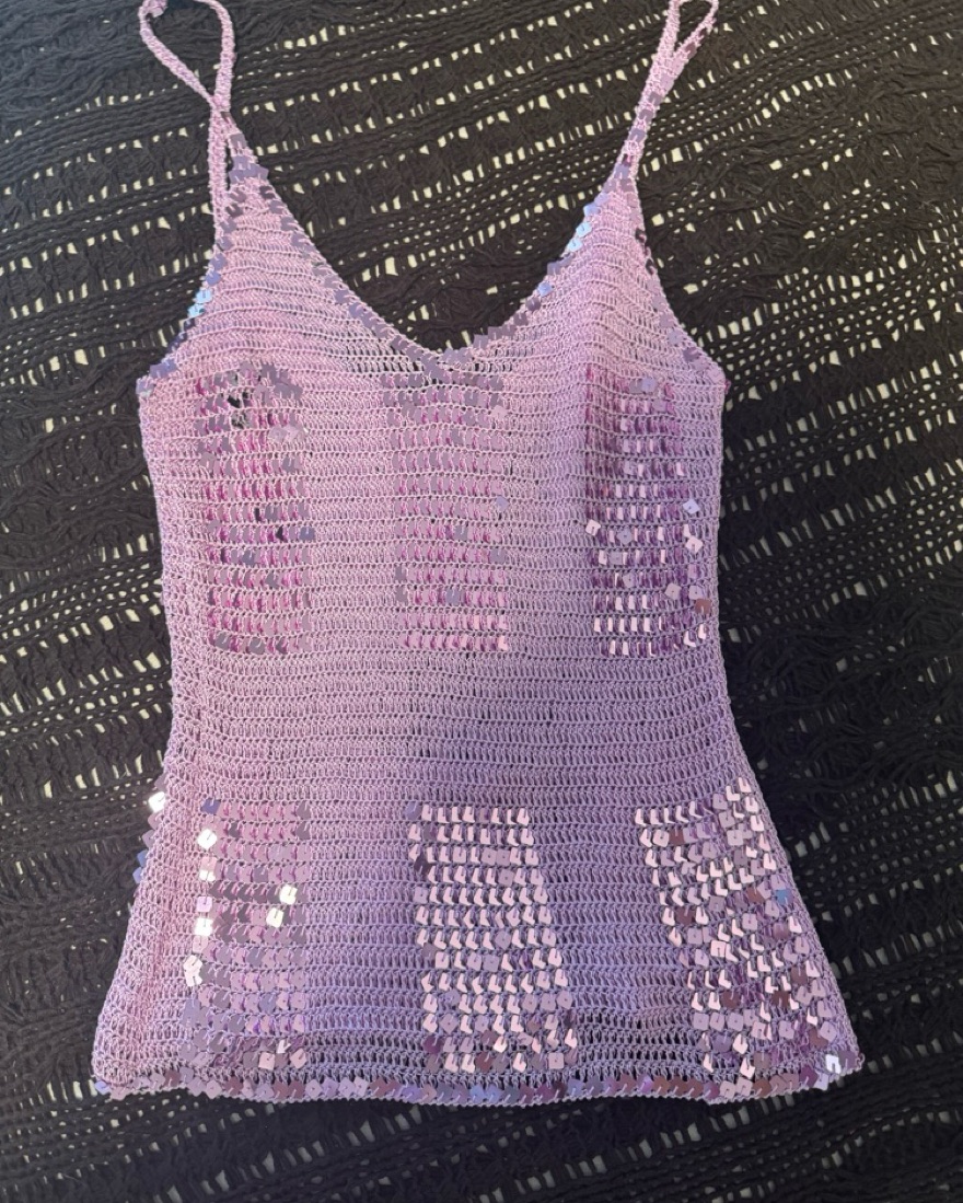Purple crochet sequin top! Fits on the looser side. Got this on Depop so don’t know the brand