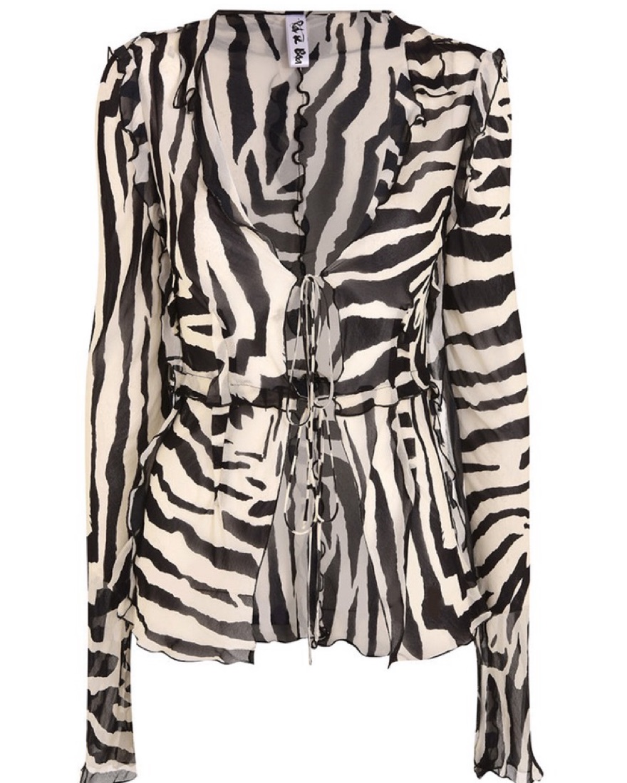 In bold, monochrome zebra print, with delicate ties and subtle frills, this semi sheer blouse will be your new favourite style, for summer and beyond.