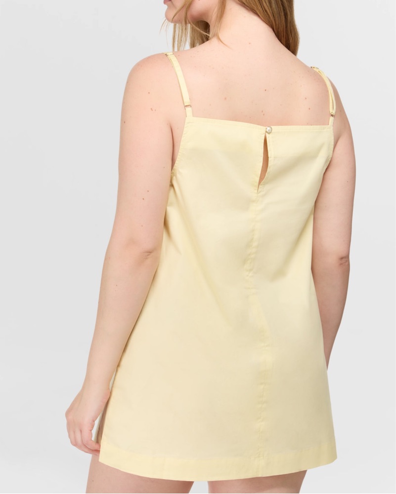 Lightweight and breathable in crisp cotton poplin, this apron-style mini is made for carefree days and sun-warmed skin. Finished with a faux pearl button closure at the back keyhole.