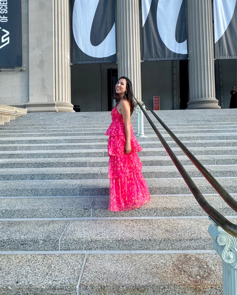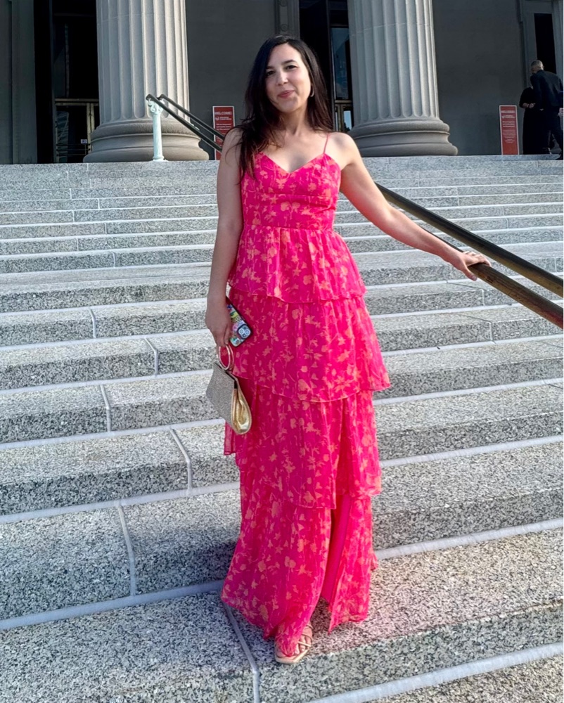 This vibrant and flirty tiered maxi dress is perfect for a summer soiree or special event. The bold floral pattern and flowing silhouette create a stunning look.