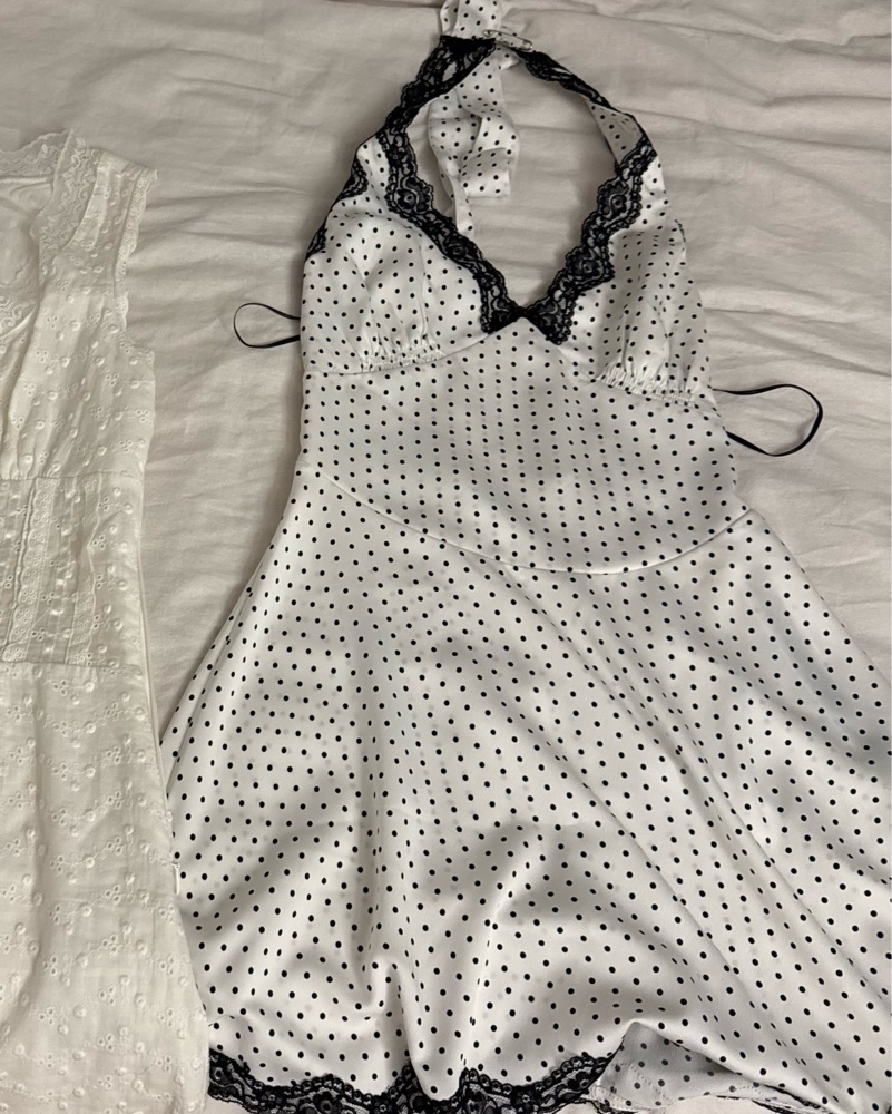 Frankies Bikinis Audrey satin mini dress. This delightful polka dot dress exudes a chic and playful vibe, perfect for a variety of occasions.