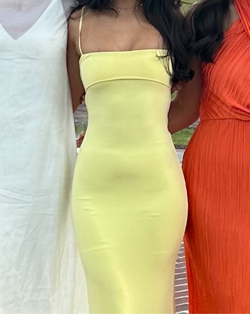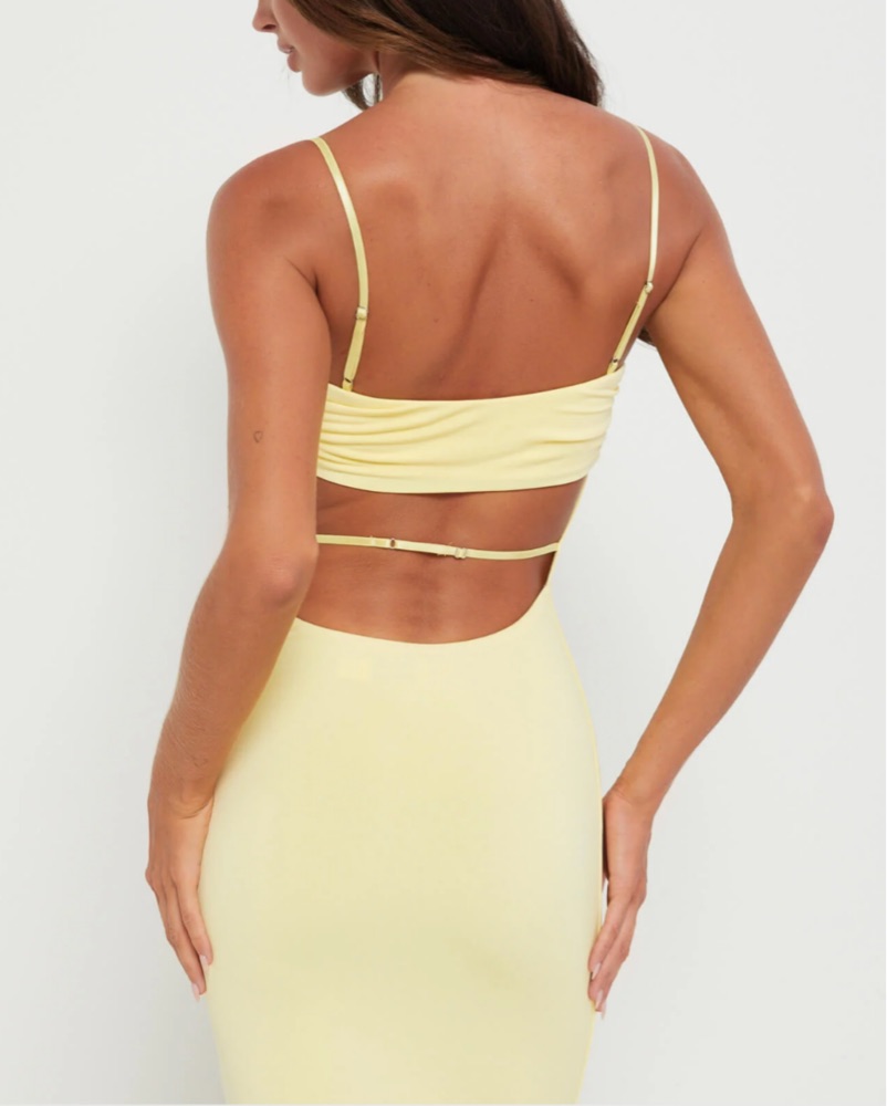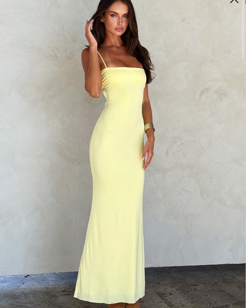 Showstopper! Pastel yellow bandeau style maxi dress. Straight cut neckline with thin adjustable shoulder straps. Gathered panel at front and back bust. Keyhole opening at back with adjustable strap for ease of fit. Fully Lined - not sheer. Can be worn with strapless bra or braless.