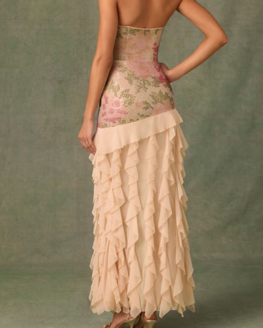 Embellished Ruffle-Trim Strapless Gown in rose. Perfect for weddings, birthdays, and events. Size 2 fits and XS. Cleaning included in the price