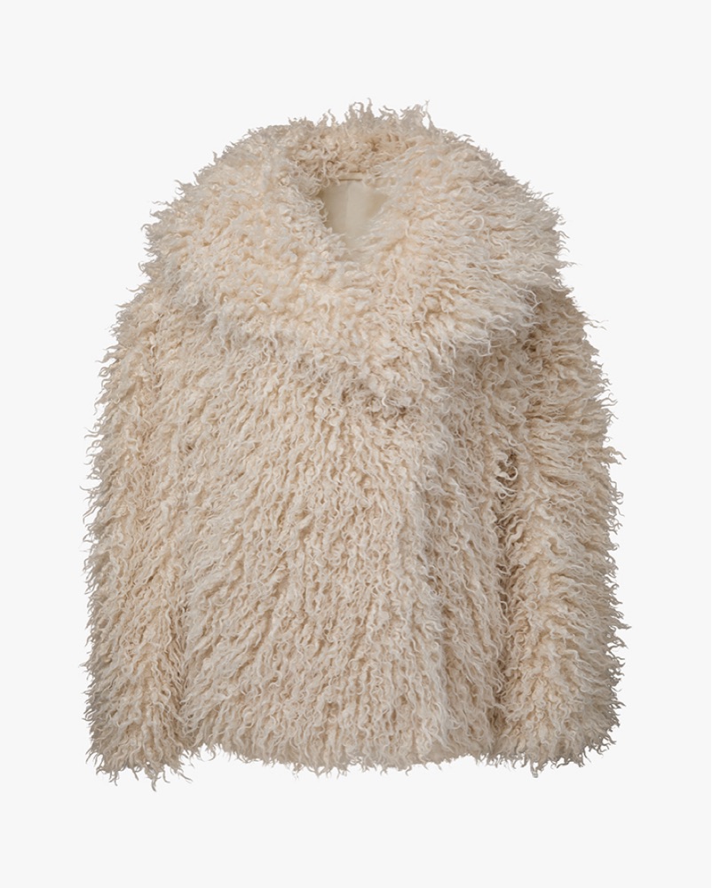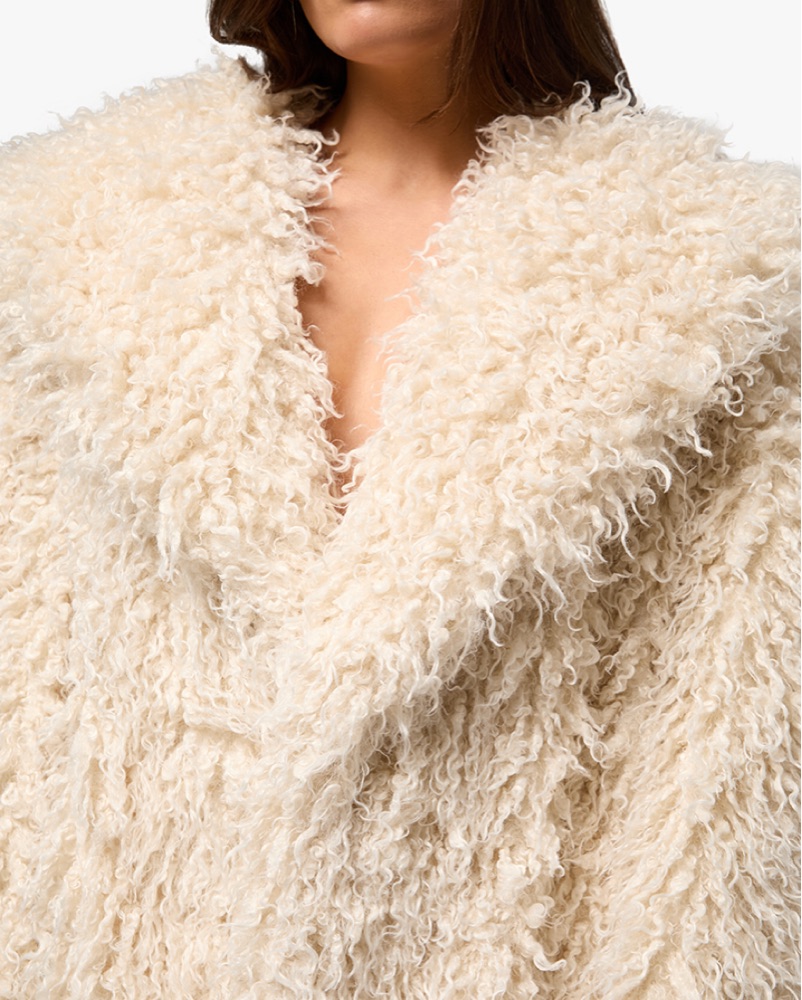 Slouchy, oversized fit, longhair faux fur, fully lined, one button closure, drop shoulders, cozy shawl collar.