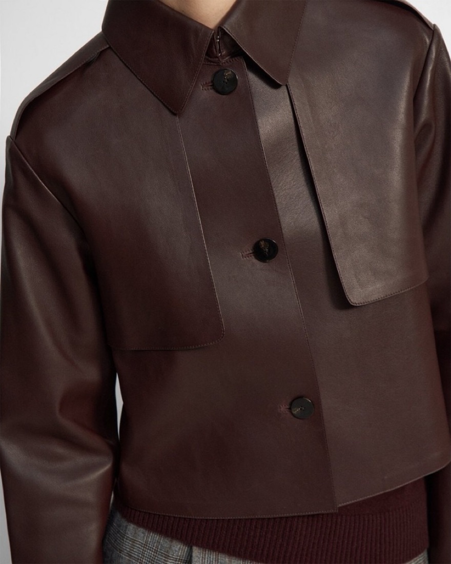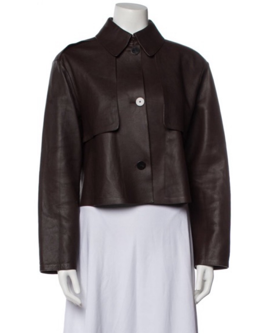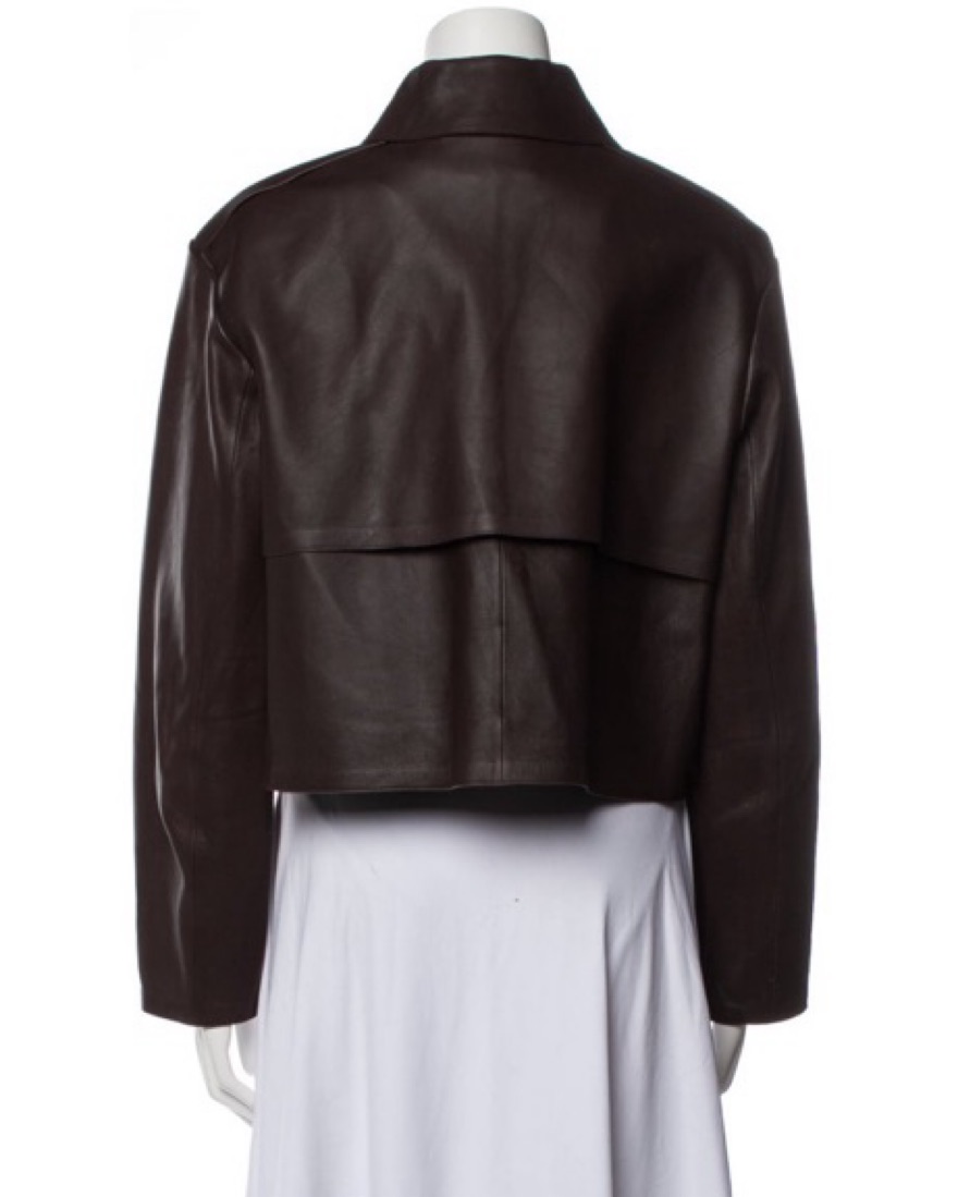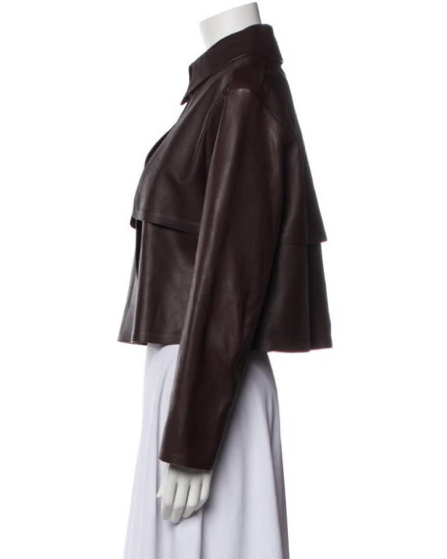 A cropped reimagining to the classic trench coat with a single-breasted front, storm flaps, and a pointed collar. Draped with dropped shoulders for a relaxed fit, this waist-grazing style is cut from sleek leather for a luxurious finish. Size M. Perfect Condition.