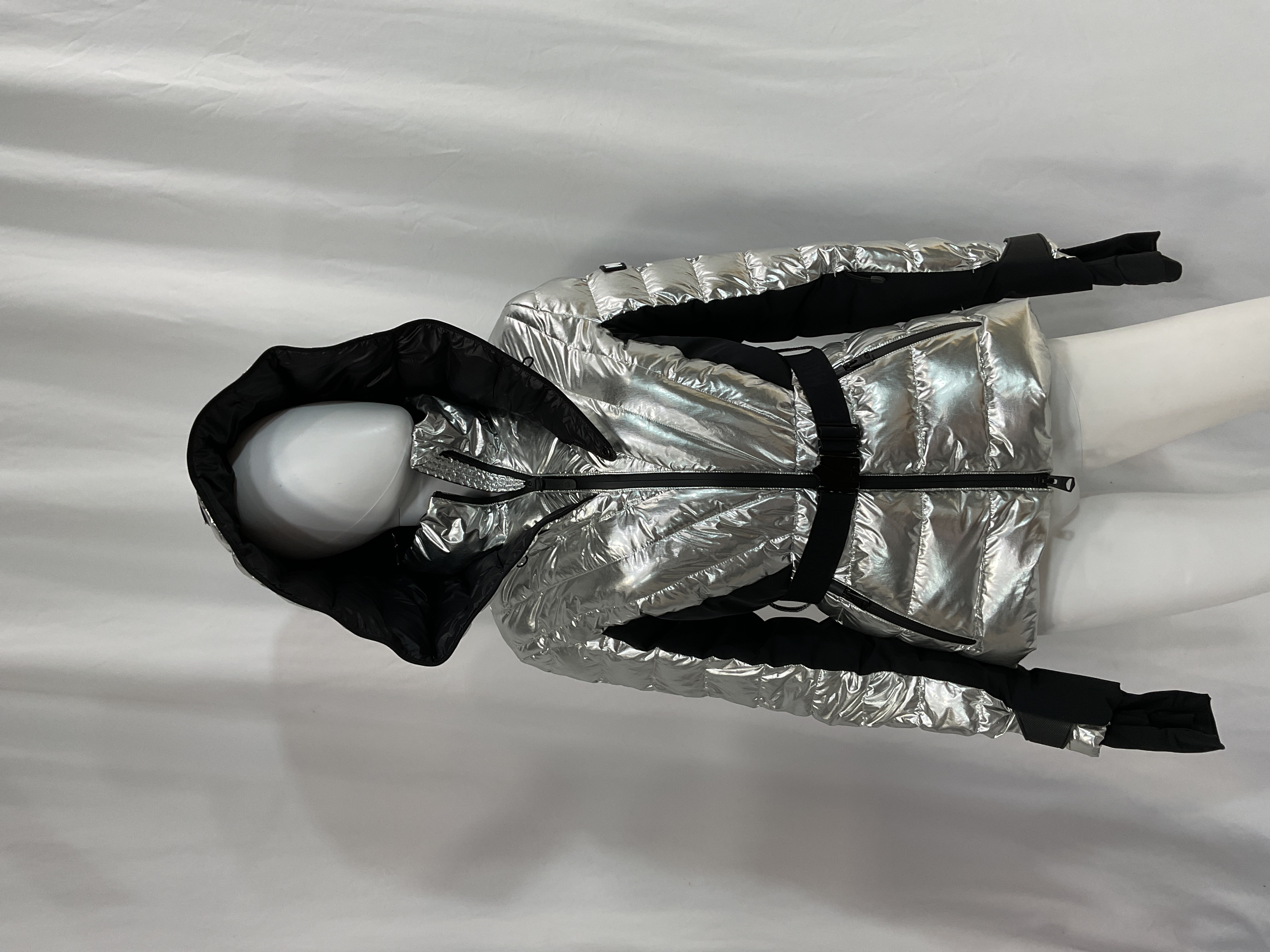Sleek metallic silver catches the light while keeping you cozy. The stand-neck silhouette adds modern edge to winter outfits.