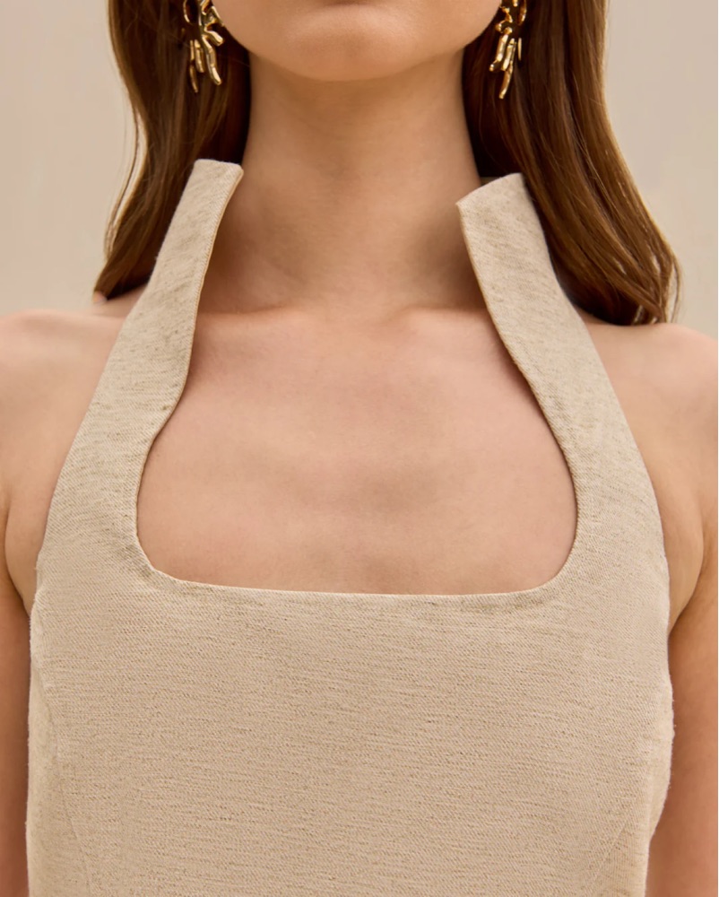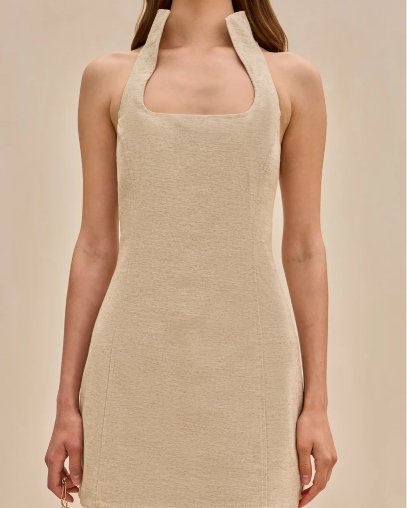 A high collar cotton linen blend mini dress with a structured body and side zip.