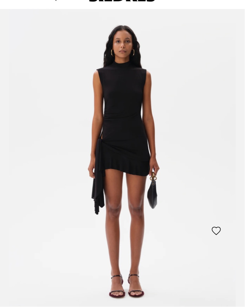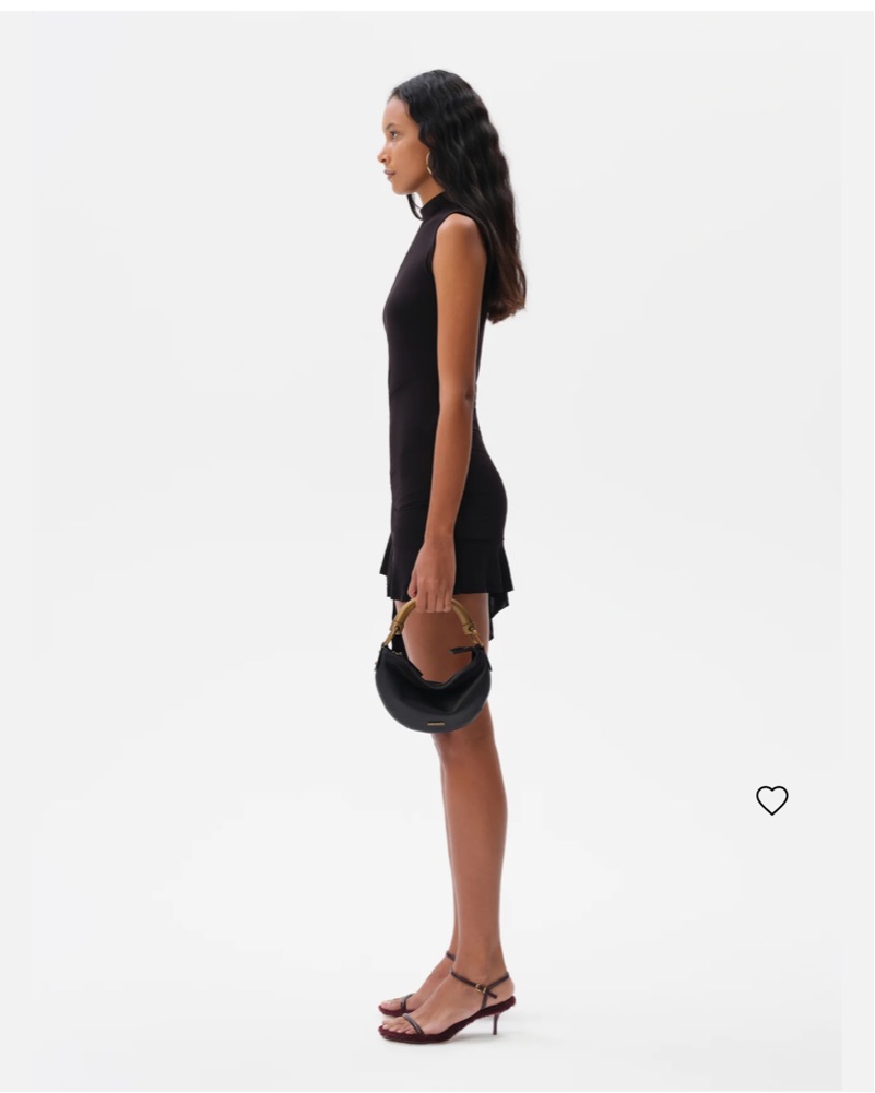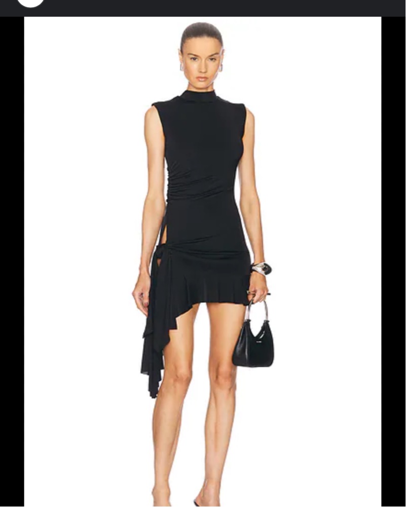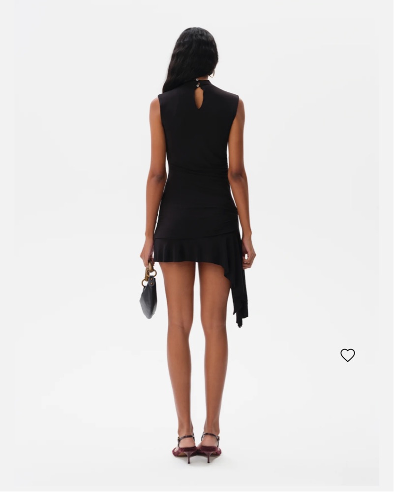 This chic black mini dress is perfect for a night out or a casual daytime look. The sleek silhouette and flouncy hem create a flattering and feminine style.