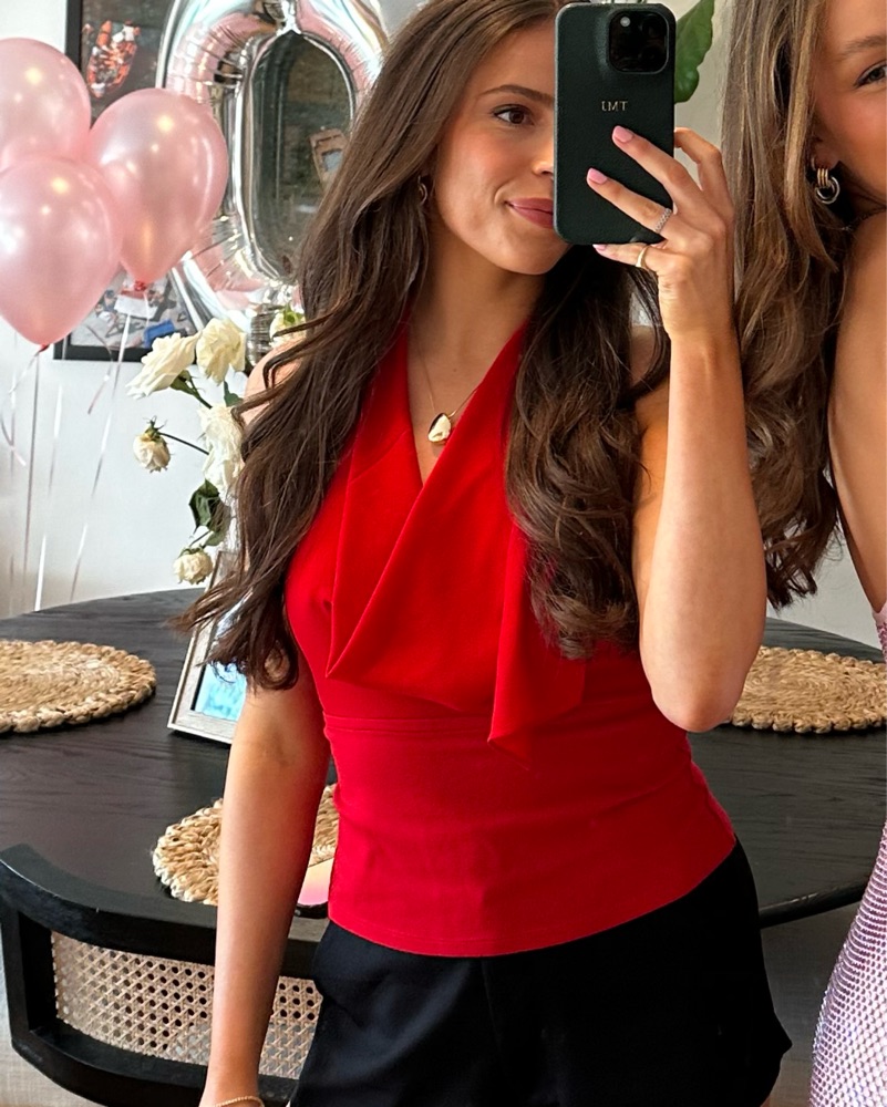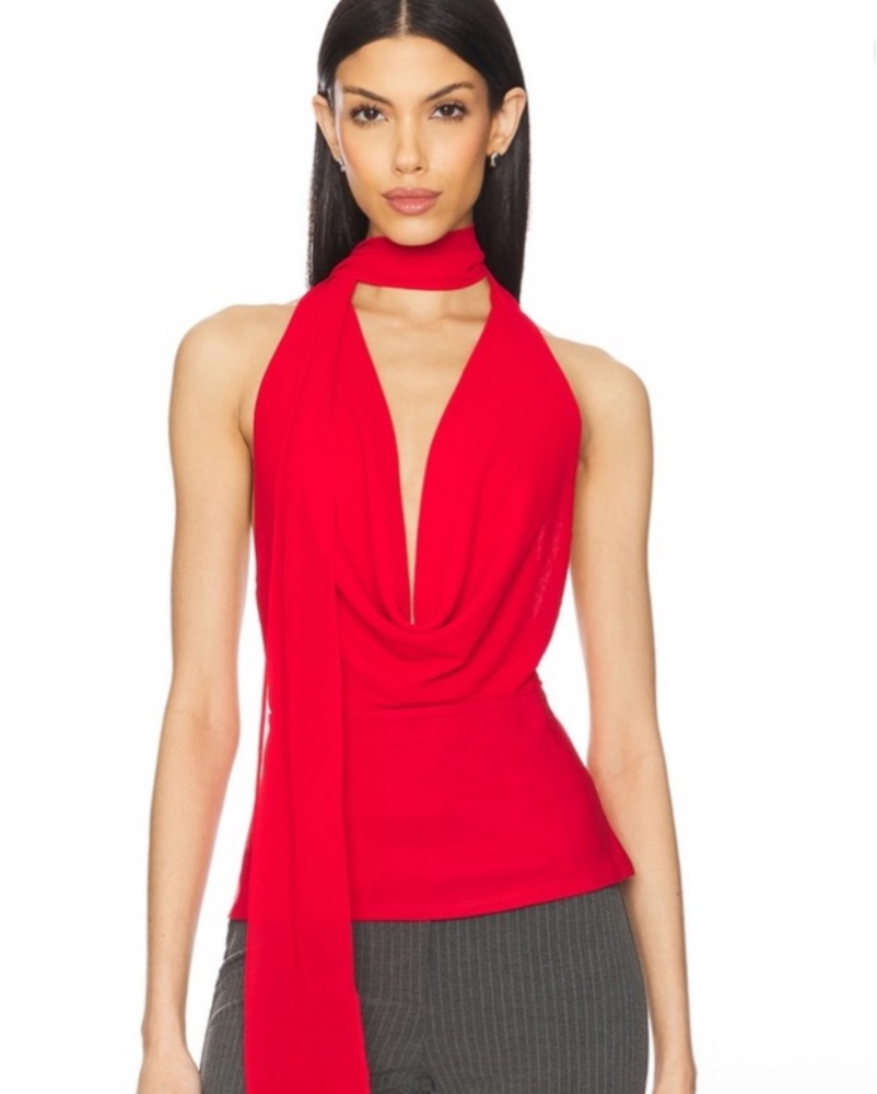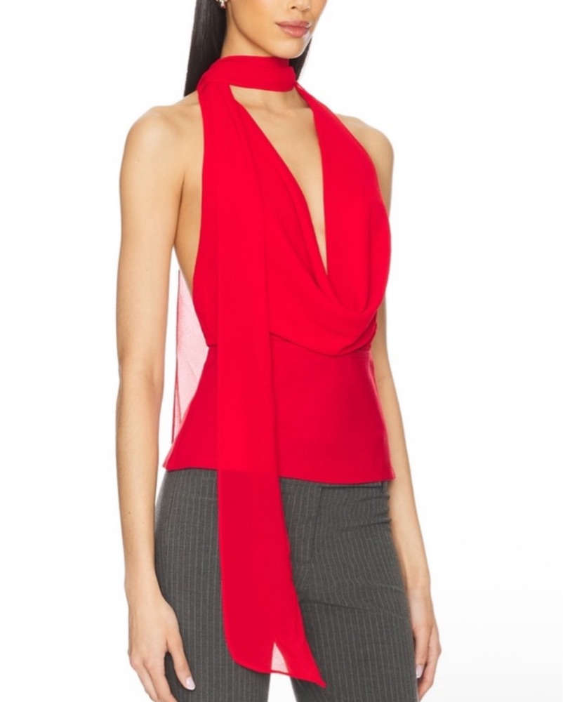 Halter self tie closure. Drape detail, open back. Lightweight georgette fabric with jersey contrast fabric. Great going out top!