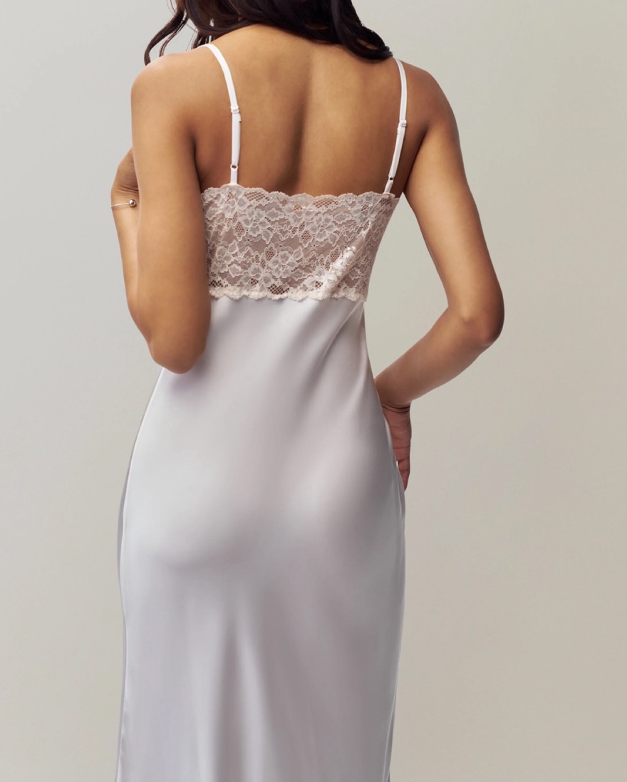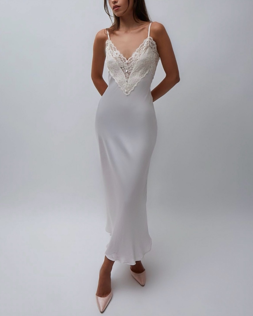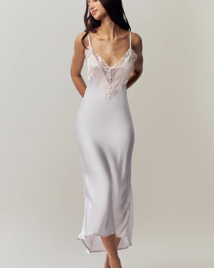Size XS. The most perfect flattering slip dress ever! It is a very light ballet slipper pink but looks white in some lighting and photos. Fabric wrinkles easily so I recommend steaming. I love this dress so please take care of it 🤍
