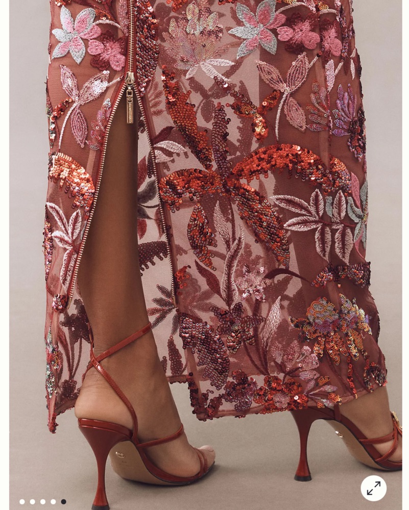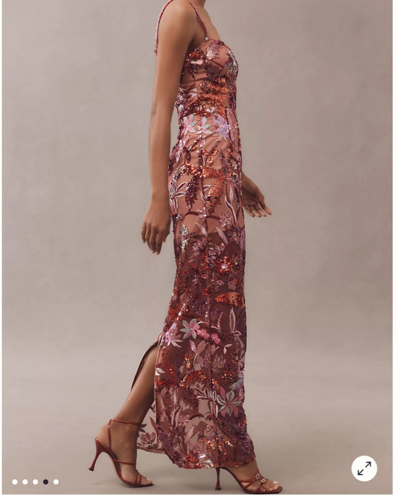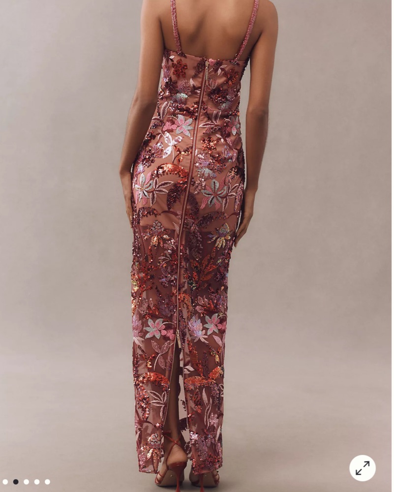 This captivating dress is perfect for a glamorous evening out. The intricate floral sequin pattern creates a showstopping look that is sure to turn heads. This rendition of the dahlia has straps!