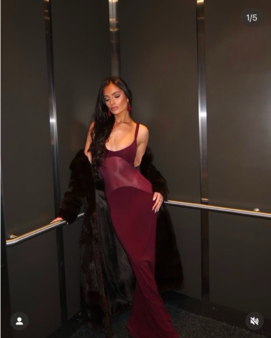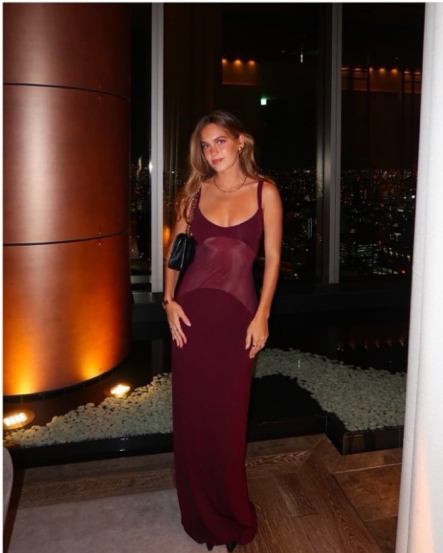 Sheer knit curve maxi dress featuring sexy mesh panel at the bodice. NYFW, wedding guest, holiday, burgundy, Valentine’s Day, Helsa, Rat & Boa, House of CB, Cult Gaia