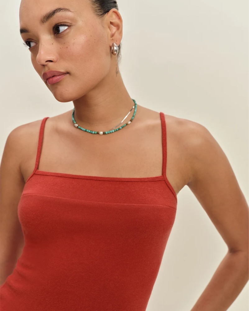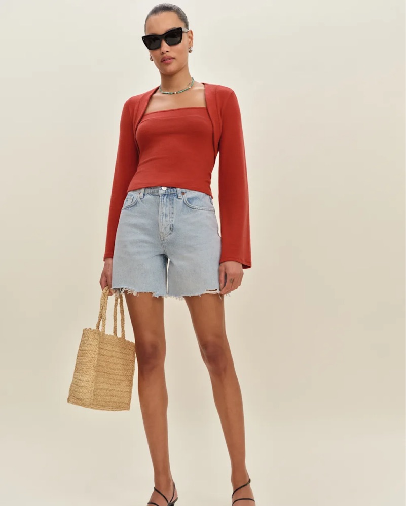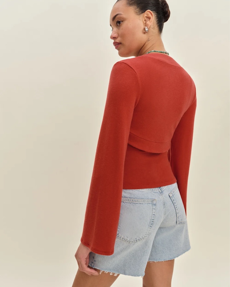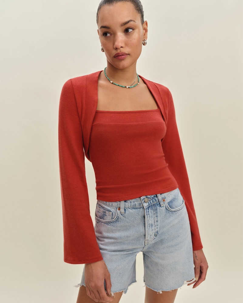 Two piece reformation top + bell sleeve shrug set is so soft and flattering. Great for colder summer days or warmer winter ones!! A go to in a perfect sun-dried tomato color.
