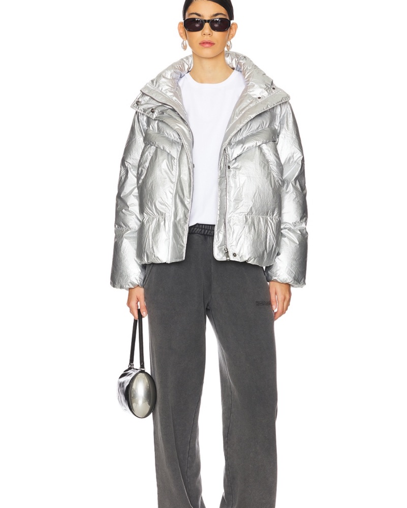 This stylish silver puffer jacket is perfect for adding a touch of urban flair to any casual outfit. Pair it with your favorite jeans and sneakers for a chic, city-ready look.