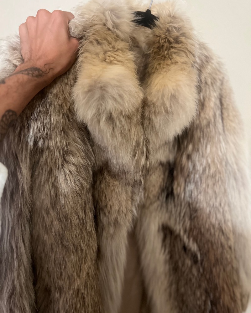 Genuine coyote vintage unisex fur coat. Sits at waist. Size S/M.