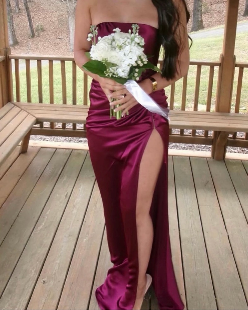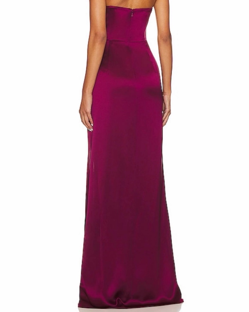 Sau Lee Hera Gown Boysen Berry strapless, maxi dress, maroon color, high slit