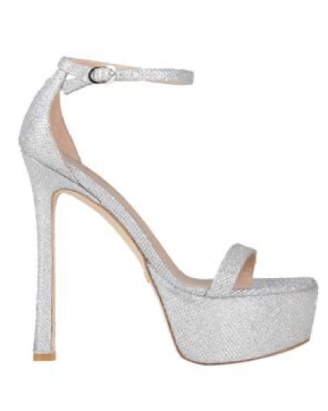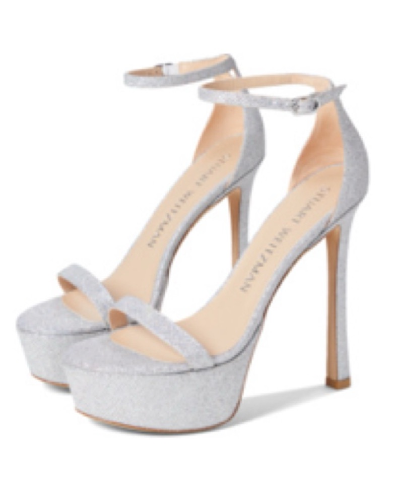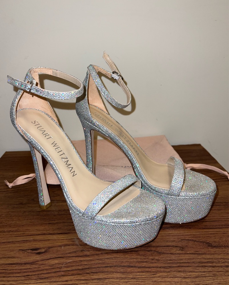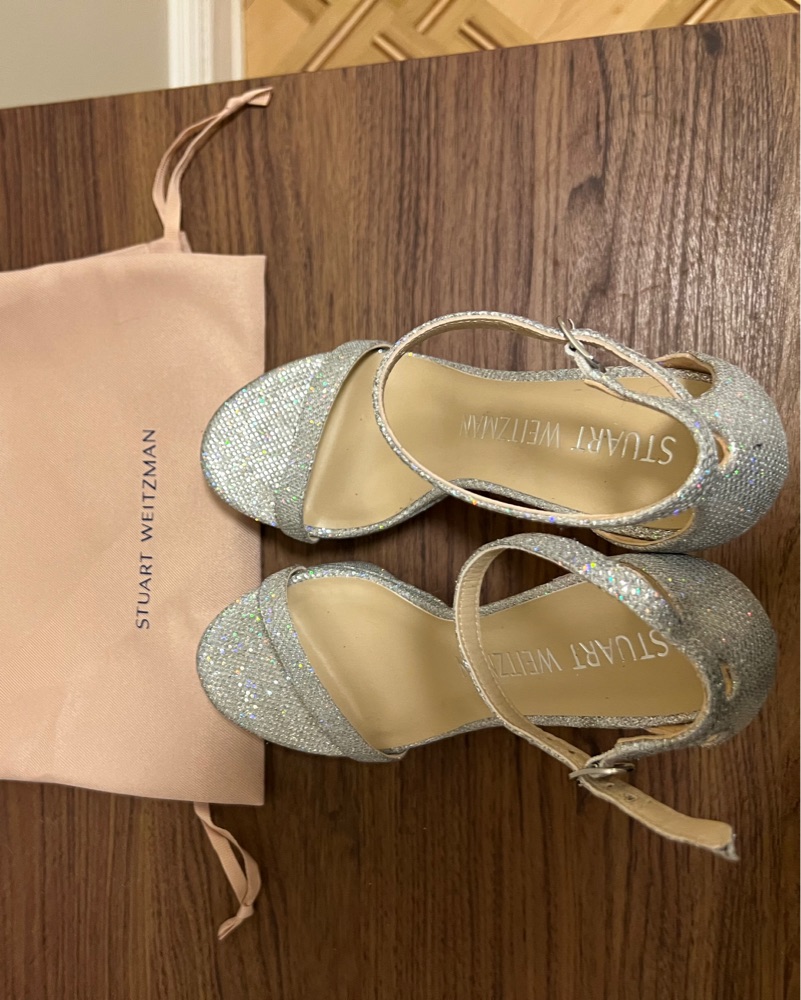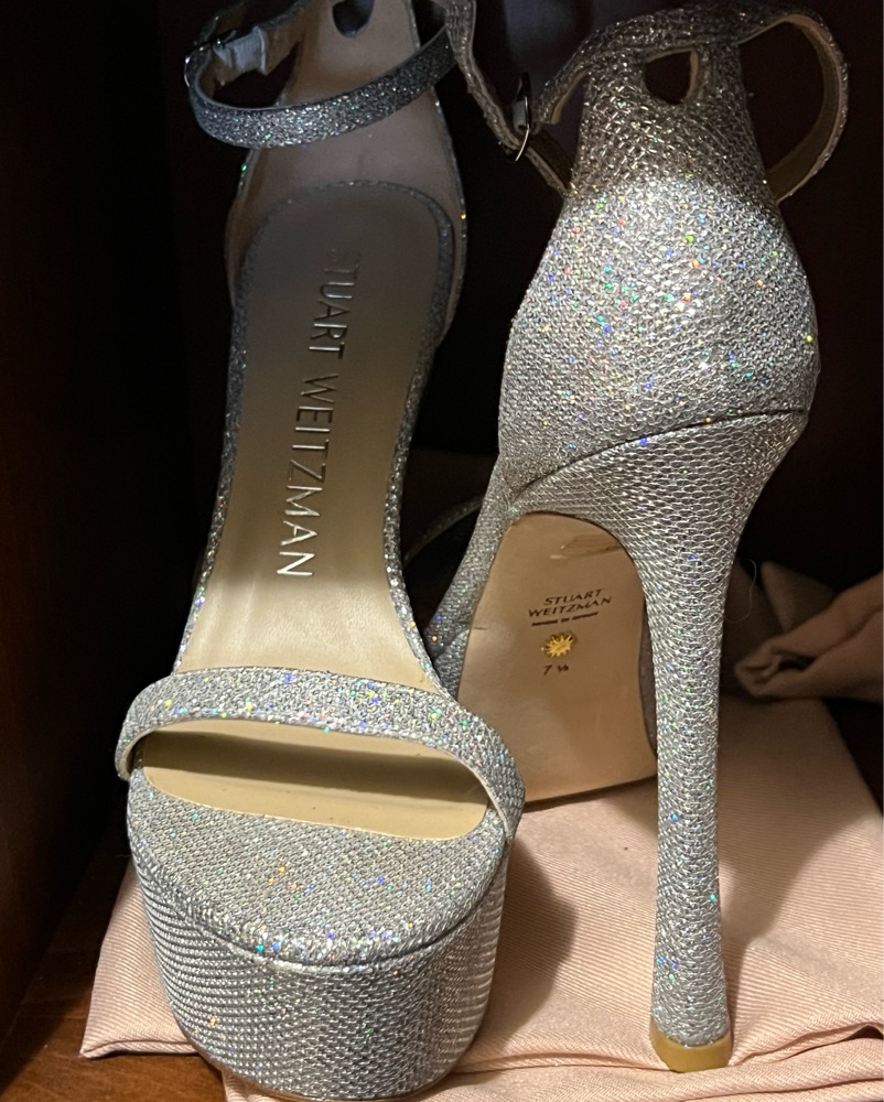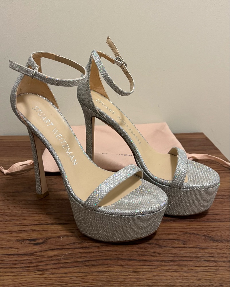 Stuart Weitzman Nudistcurve platform heeled sandals. Gorgeous silver shimmer color- the photos don’t do them justice. In excellent condition. Size 7.5. Heels 6”, platform 2”. Very comfortable & sturdy, esp considering how high the heel is! I also have these listed in the pink suede colorway.