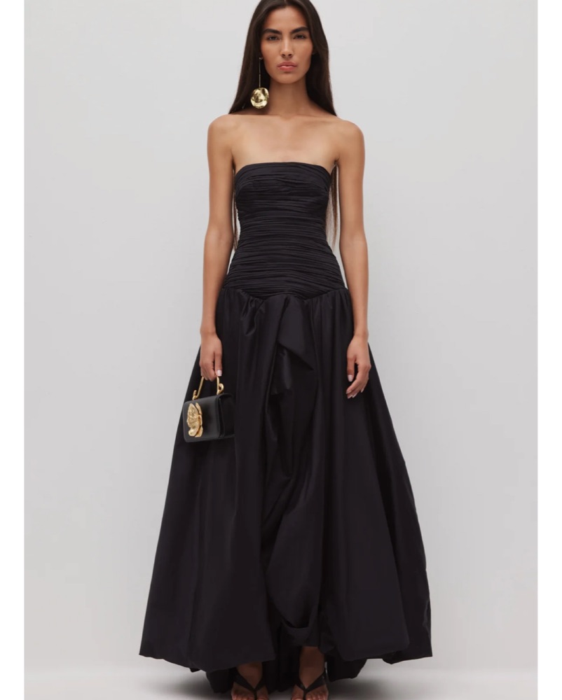 Fitted through the bust and waist before falling into a voluminous, draped skirt with an asymmetrical bubble hem