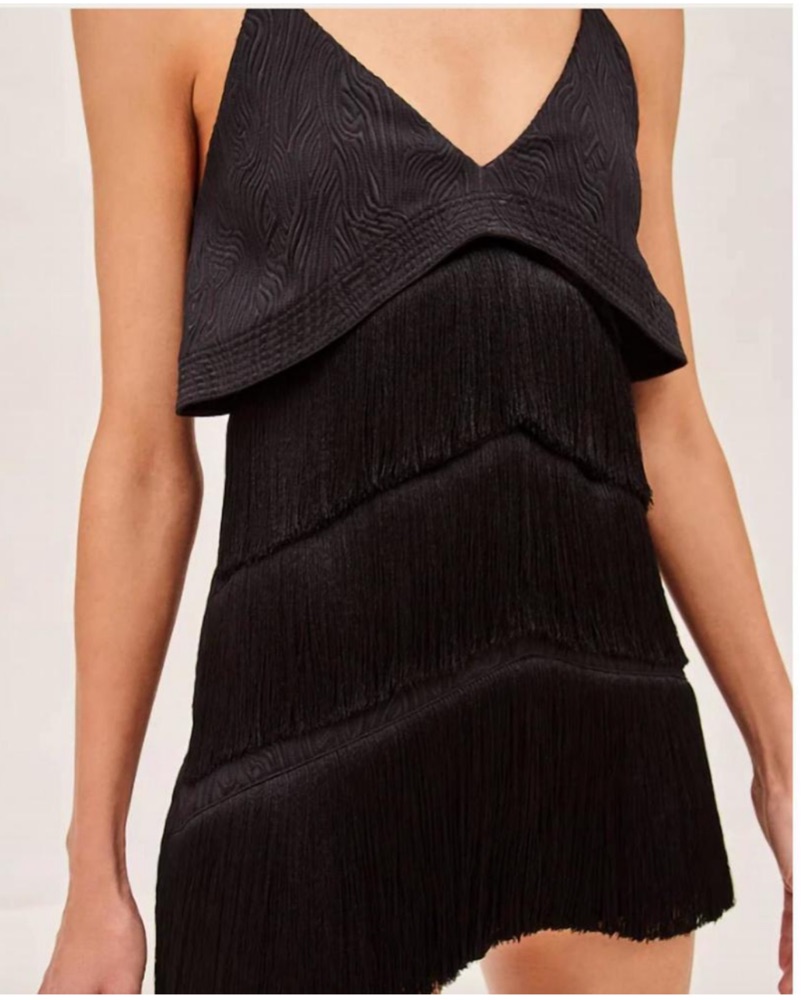 Size medium fits great black mini Alexis romper with fringe all in front