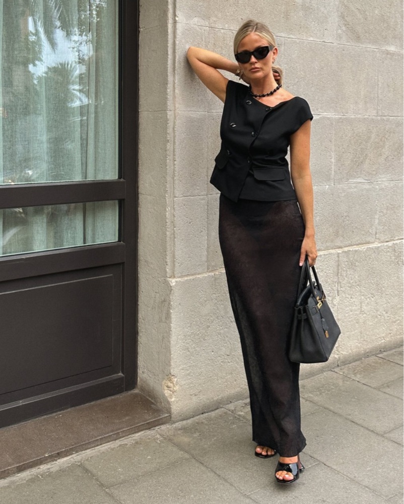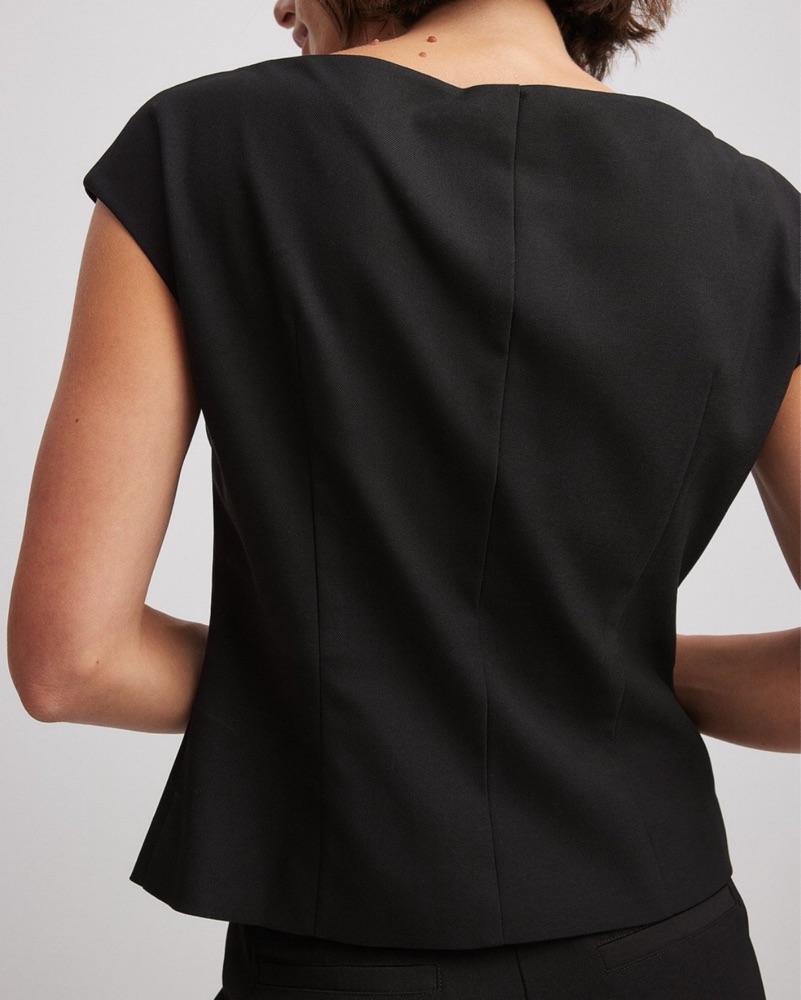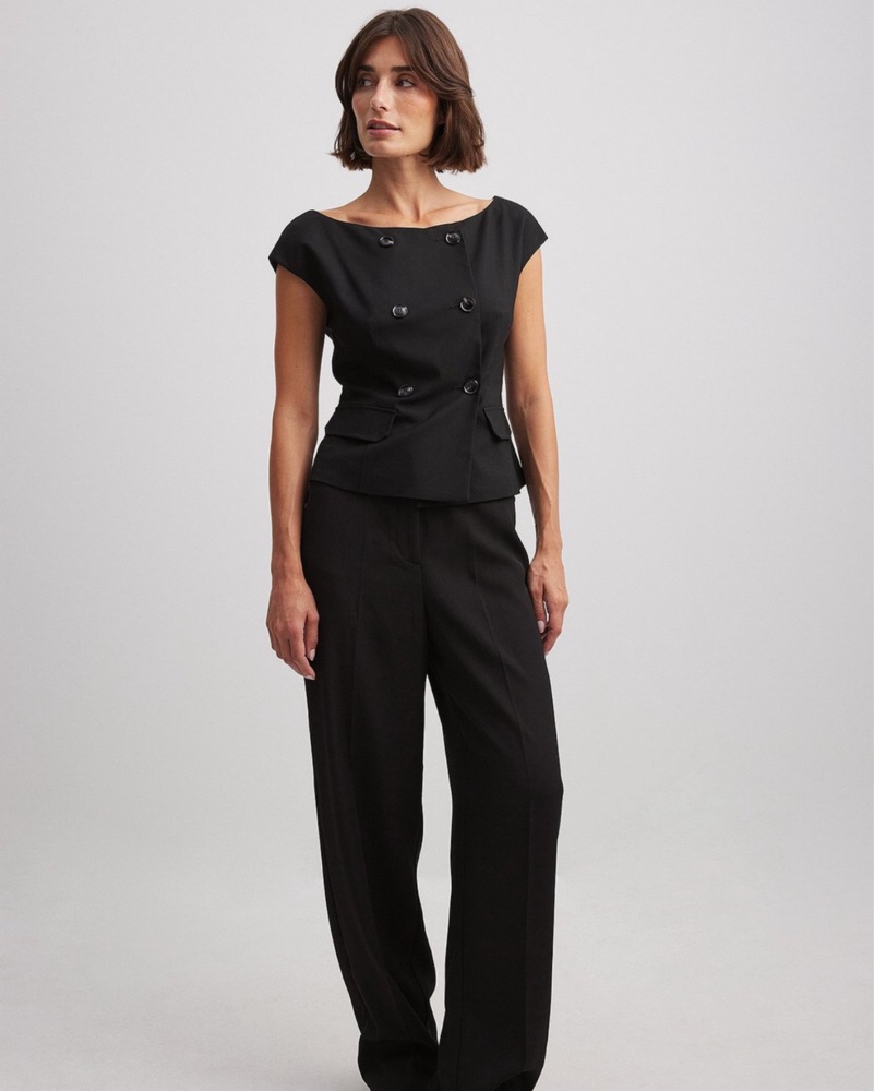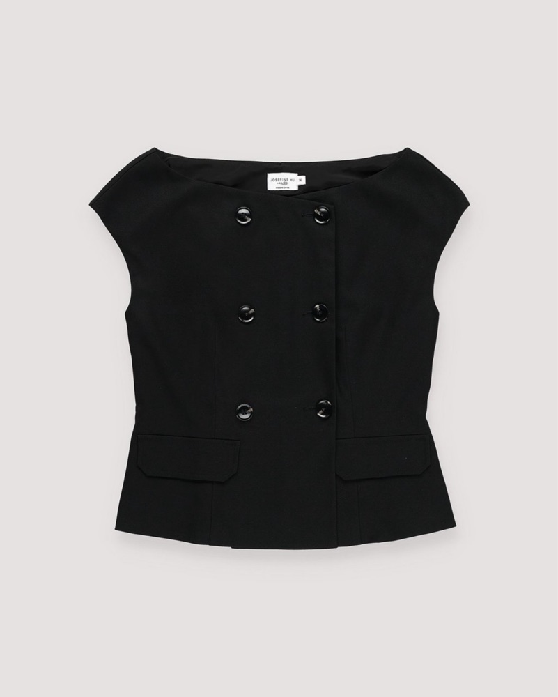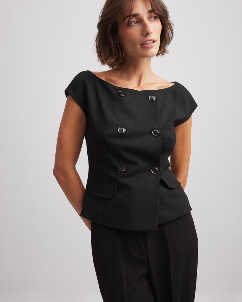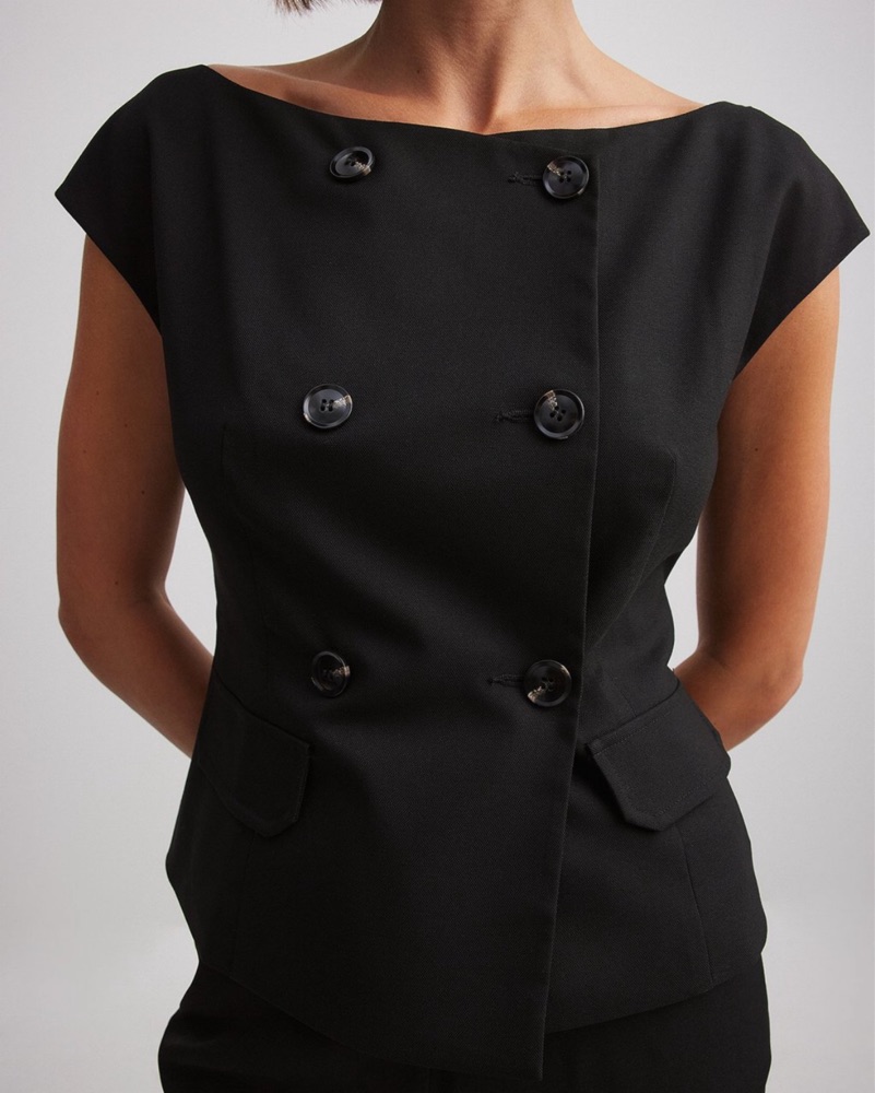 This top features a tailored fit. It has a boat neckline and short sleeves. This top features a double-breasted button design and a fabric lining. This blazer comes in black.