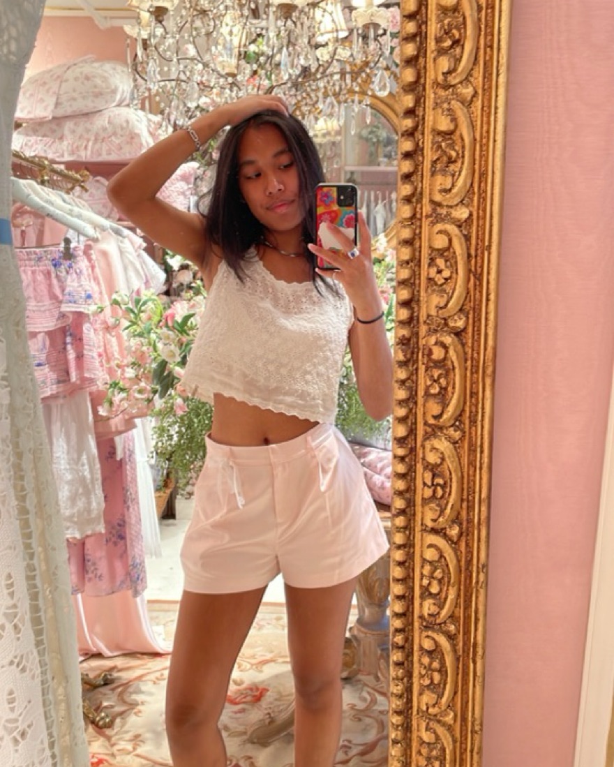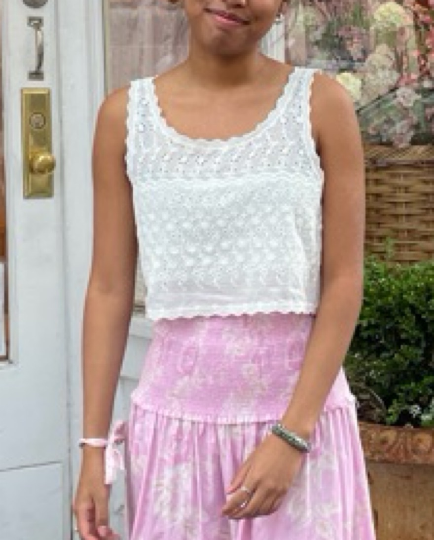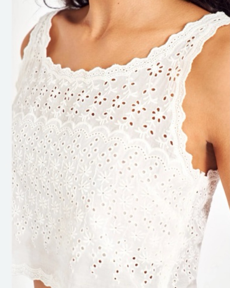 Gorgeous eyelet cami styled crop. Beautiful and delicate. Elevate any outfit with this top! Has a lining under and zip up on the side. Perfect to wear with a high waisted skirt or pant. But also cute for a low waisted look.