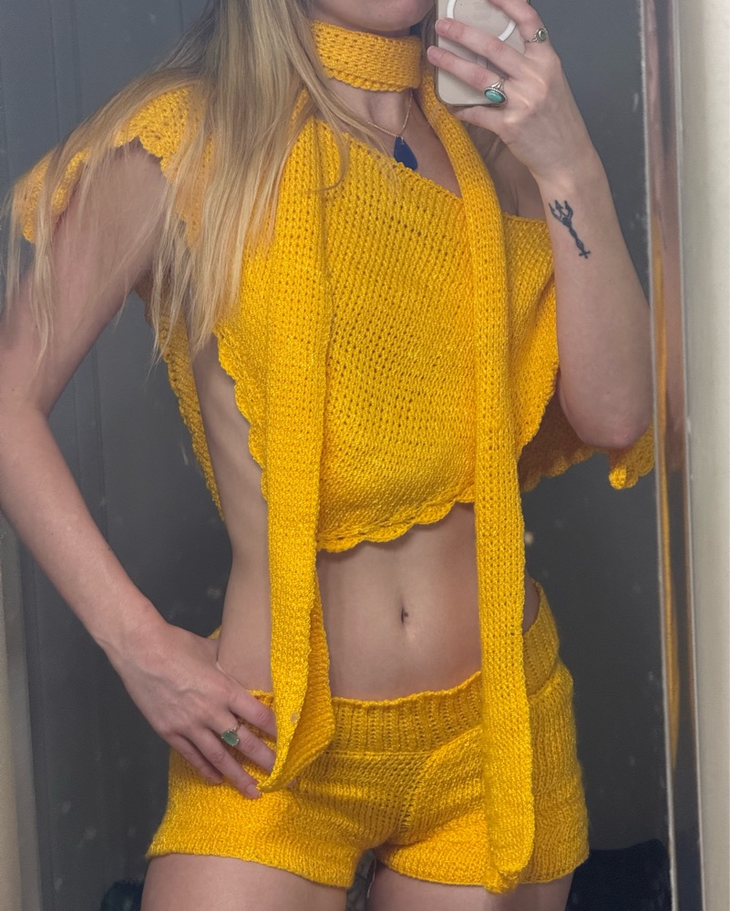 Got a recreation of this set Sabrina wore in her Manchild music video handmade! It’s closer to the darker yellow last pic shows the true color includes top shorts and scarf! Best fits XS-S