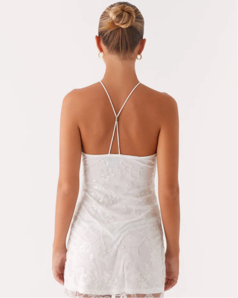 The Rumi Beaded Mini Dress is the epitome of chic and glamour. With a flattering halter neckline and intricate string back detailing, this dress offers a bold yet elegant look. Brand new with tags.
