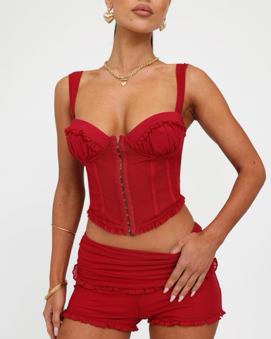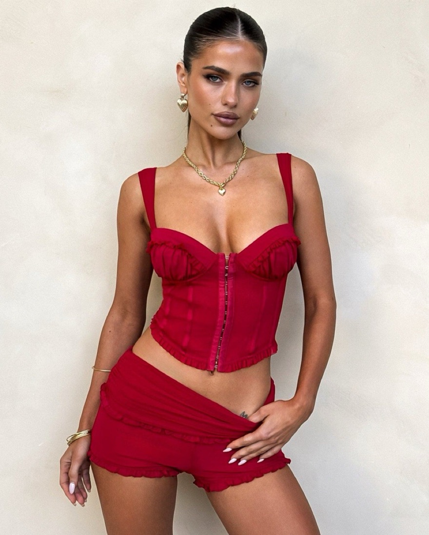 Gorgeous top in mid length and bodycon silhouette. It contains cups with gathers and ruffle detail, featuring functional lace up detail at back