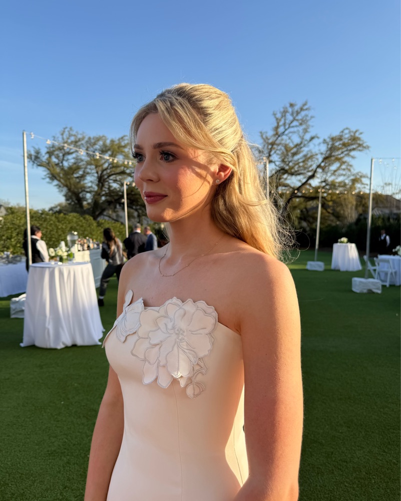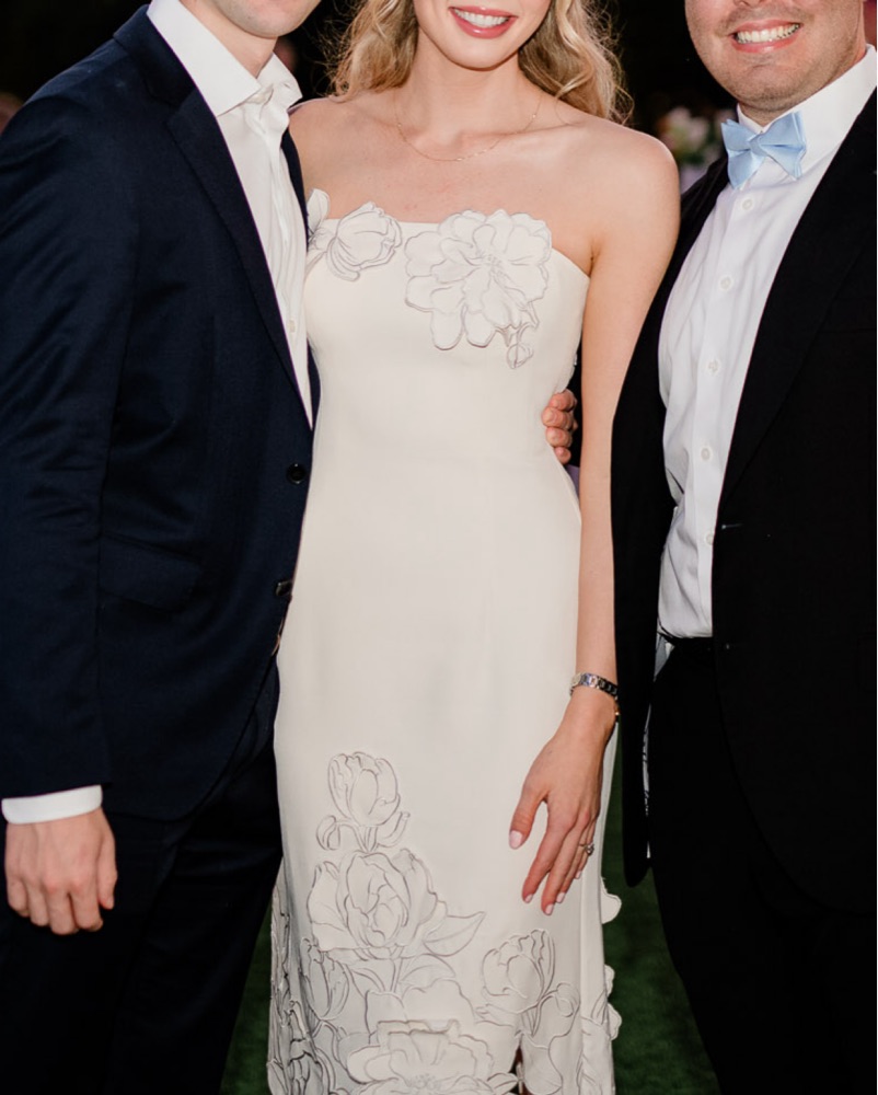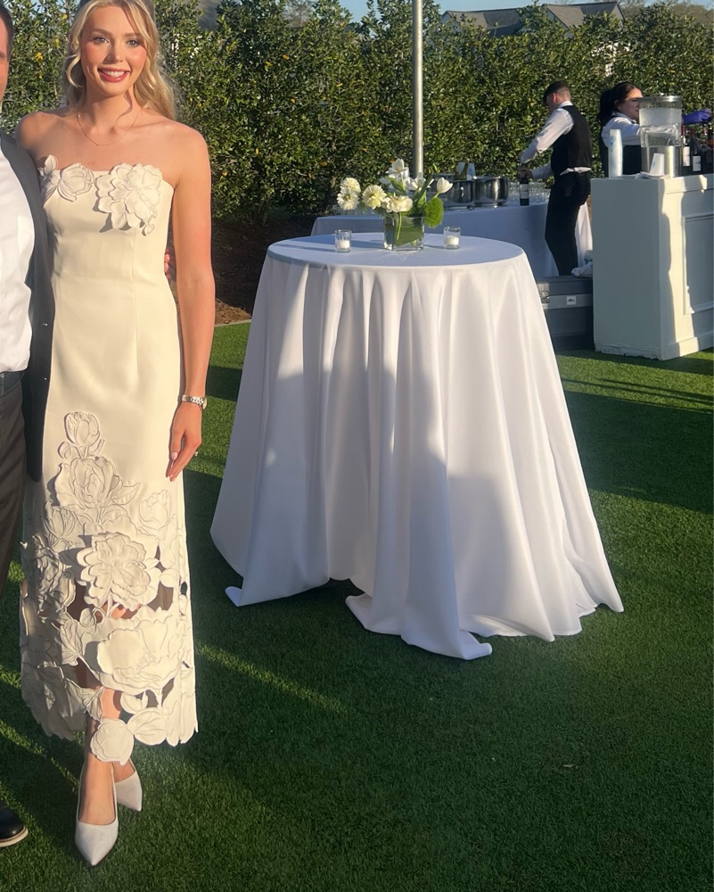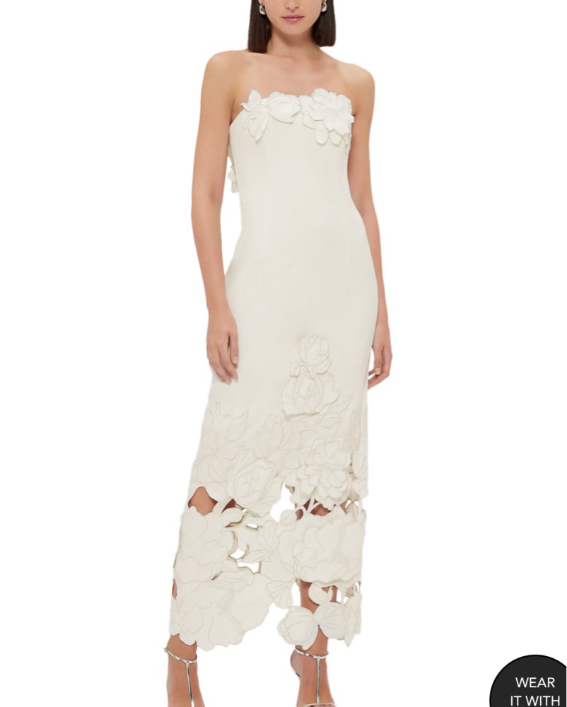 Leo Lin Rayna Crepe Strapless Dress - Vanilla. Beautiful floral appliqués with silver outline threading, fitted bodice, hidden zipper, built in cups, ankle length, structured thick material, not see through, invisible zipper. Worn once. Great for wedding events, bridal dress, engagement party!