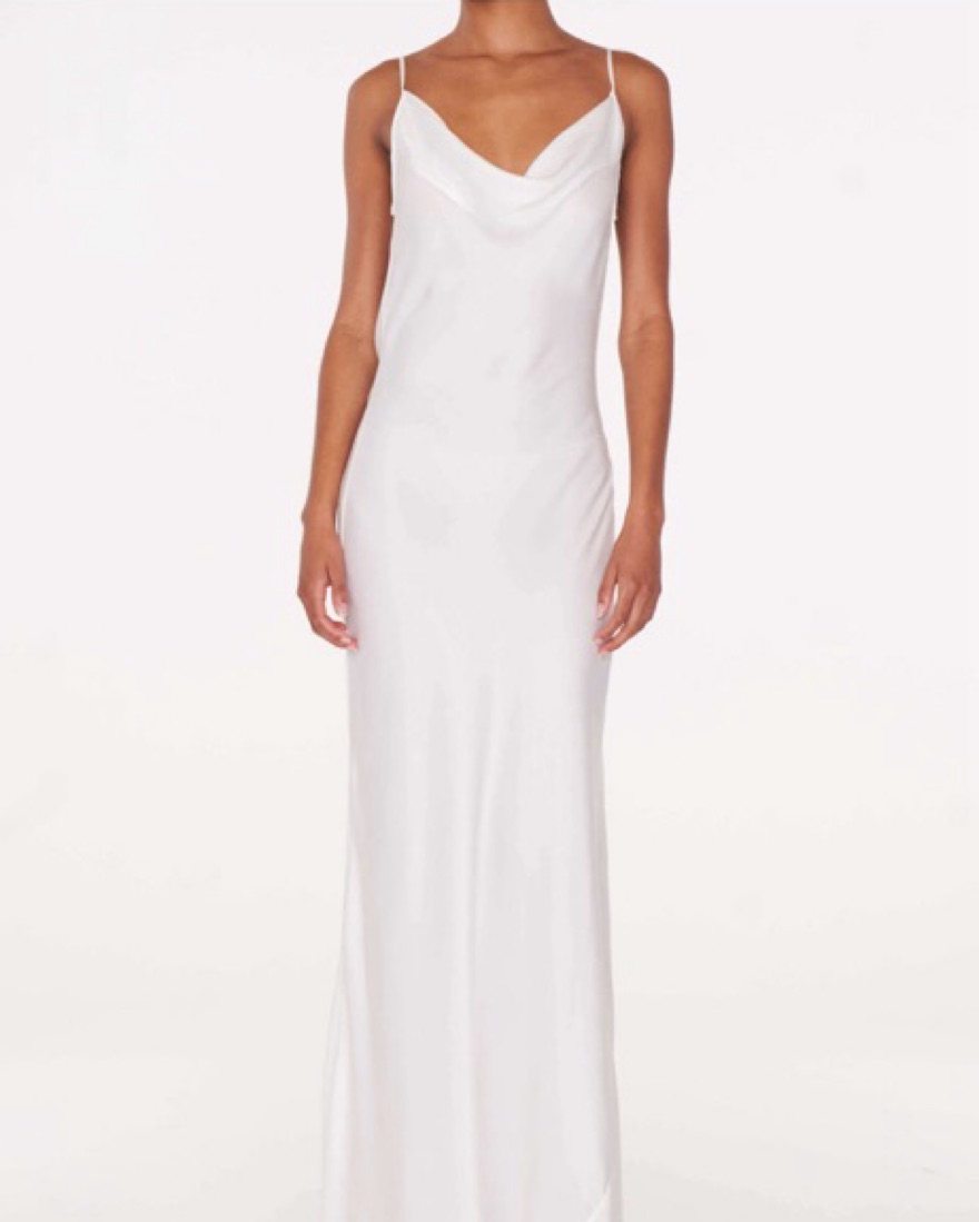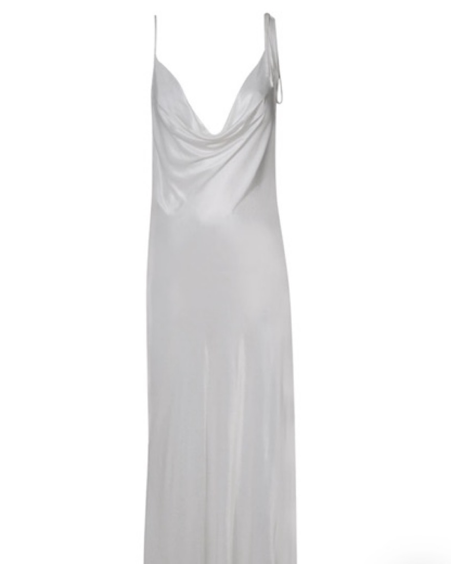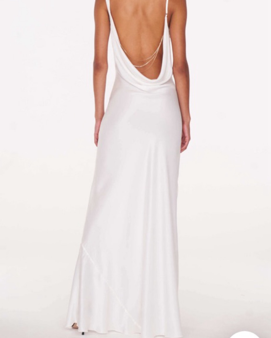 A slightly-transparent white satin dress Cowl front and back One shoulder self tie Adjustable strap Detachable chain detail at back Delicate item