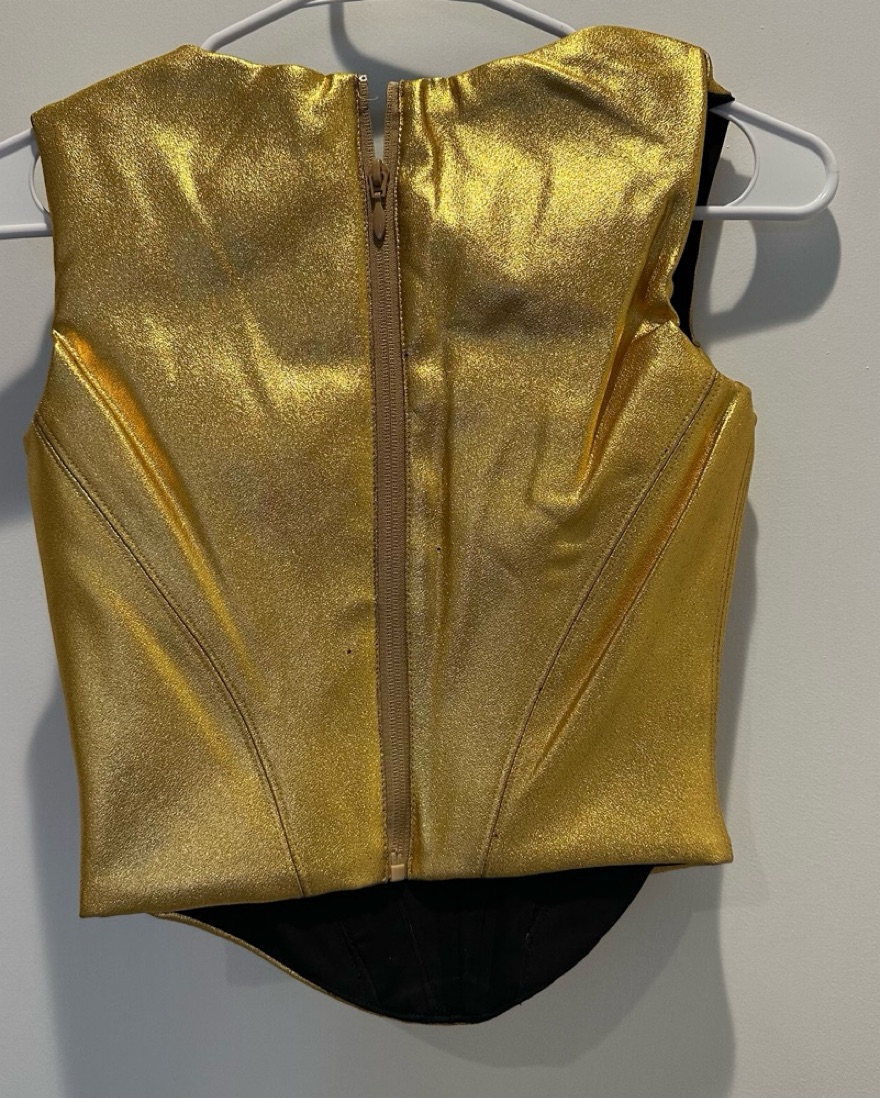 Elevate any look with this stunning gold metallic crop top. Perfect for a night out or special event. Gold corset