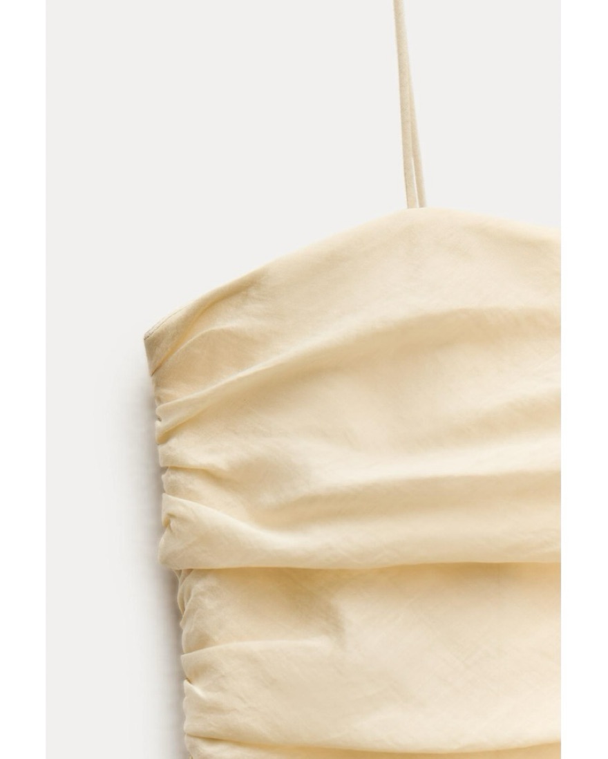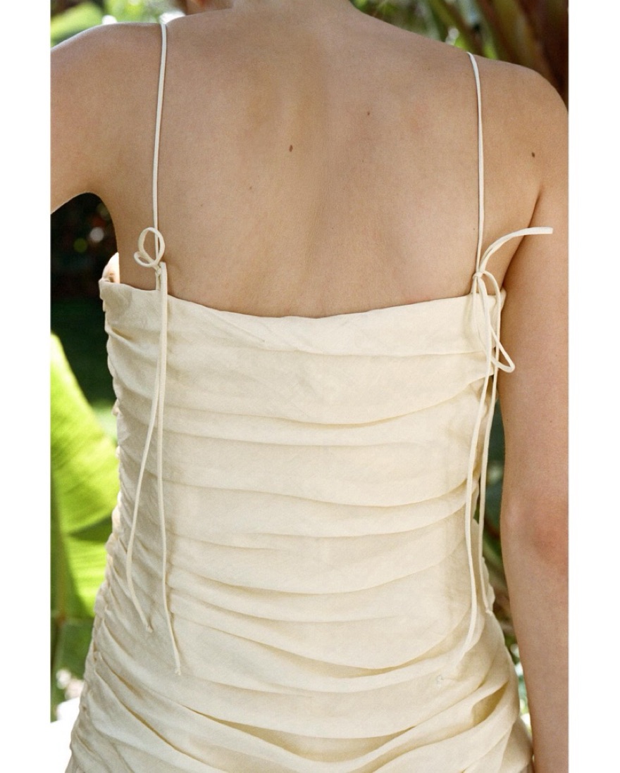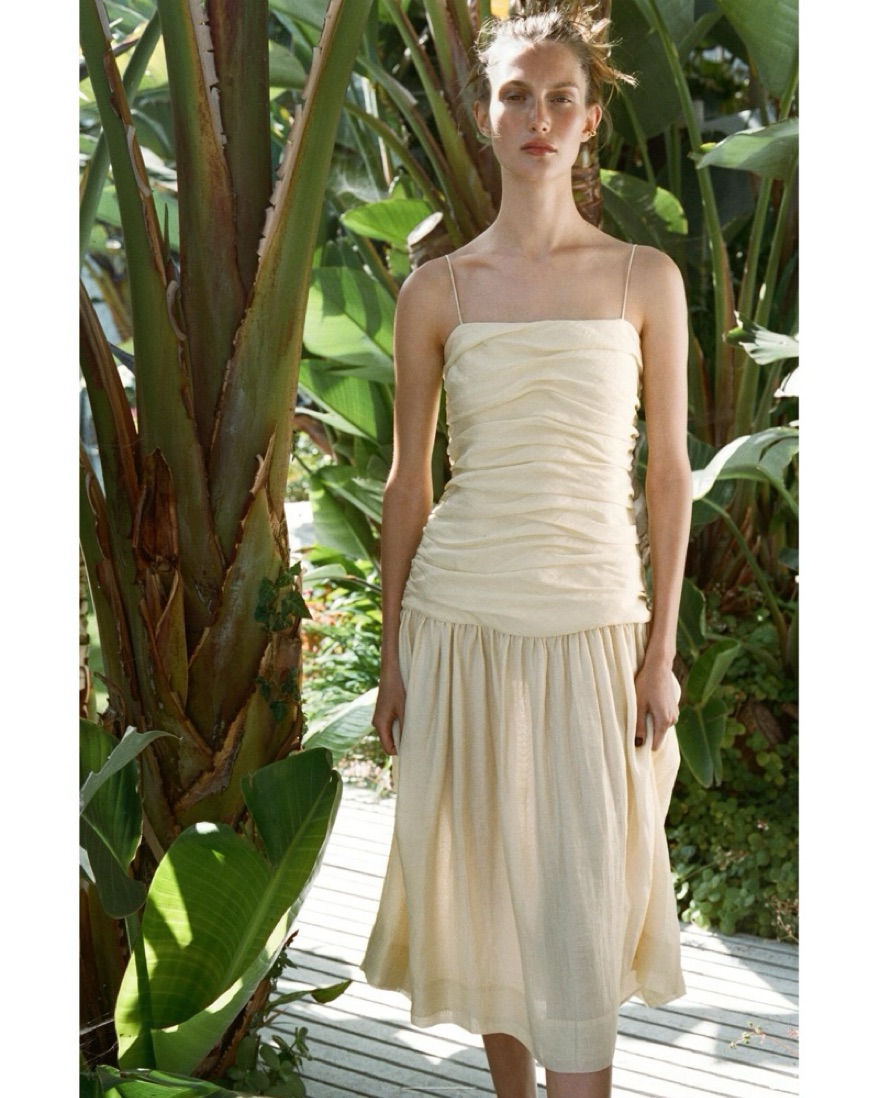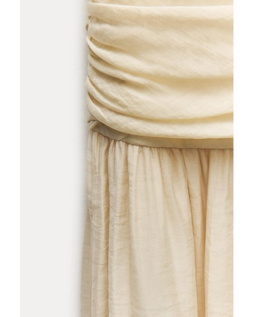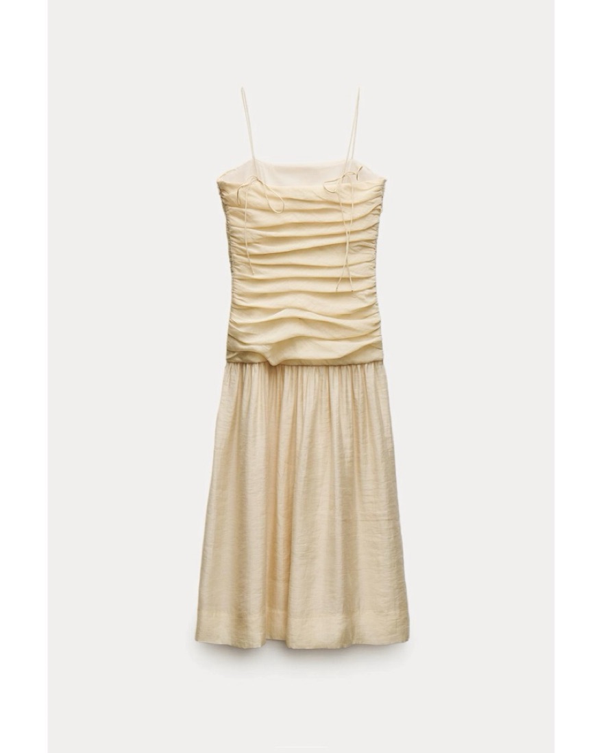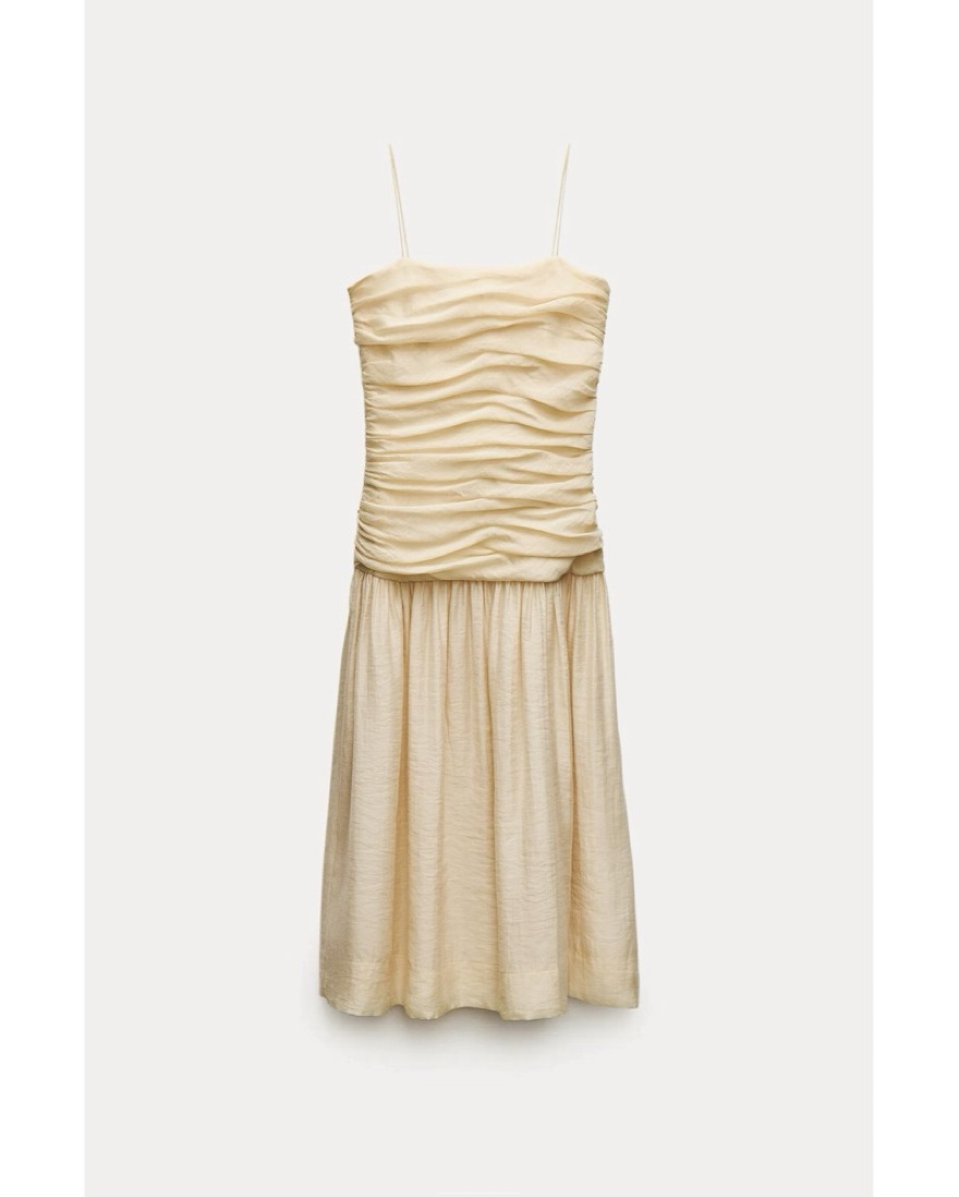 Cream colored / pale yellow draped midi dress. The straps are adjustable. There is a zipper closure on the side. The skirt part is semi sheer but not to the point where you need a slip. The dress has zero stretch to it.