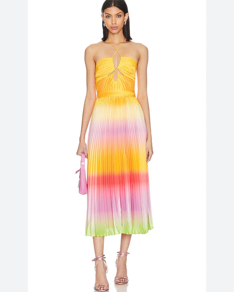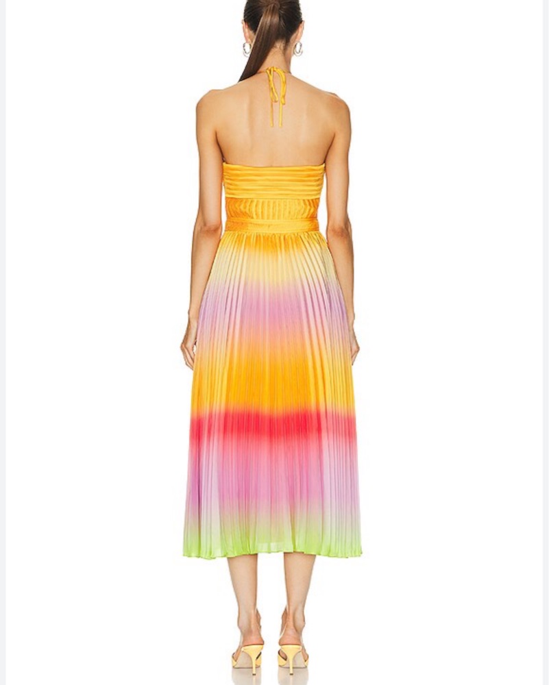 This stunning midi dress features a vibrant ombré print that transitions seamlessly from yellow to pink. The pleated bodice and skirt create a flattering, feminine silhouette.