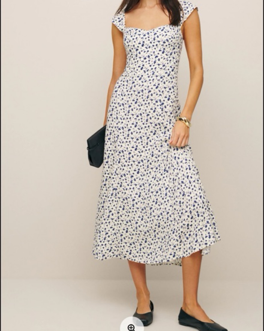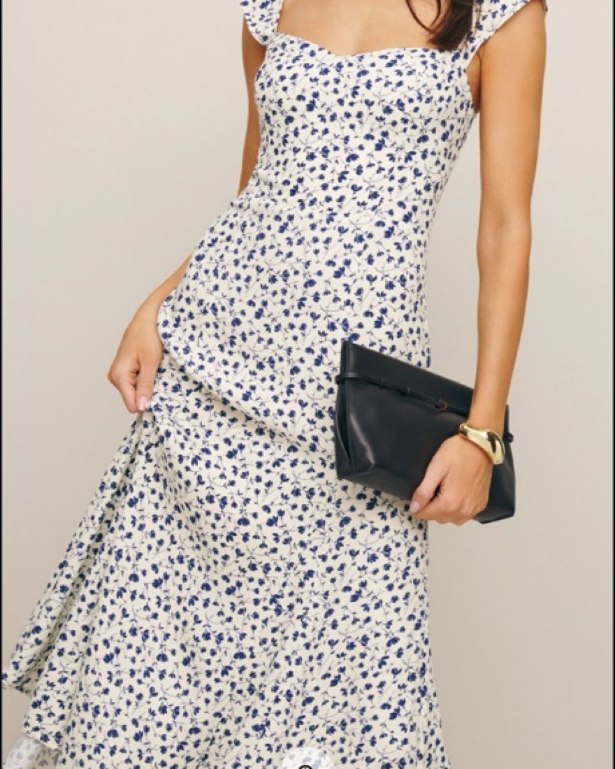 This charming midi dress features a delicate floral print, perfect for a summer garden party or outdoor wedding.