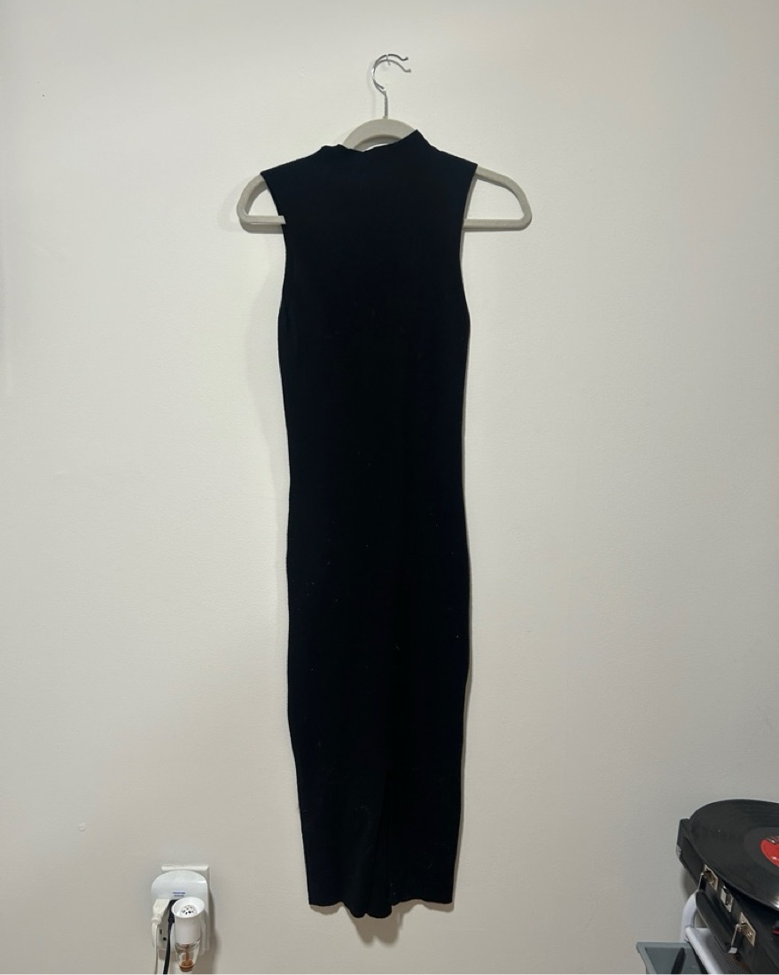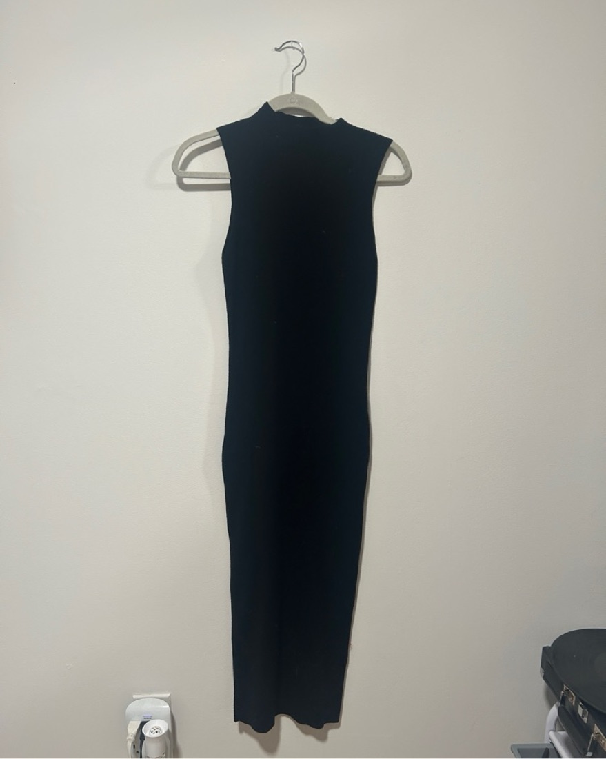 Hits right at my ankles, very comfortable and form-fitting knit dress from Express. Mock neck tank on top and has a low middle split in the back.