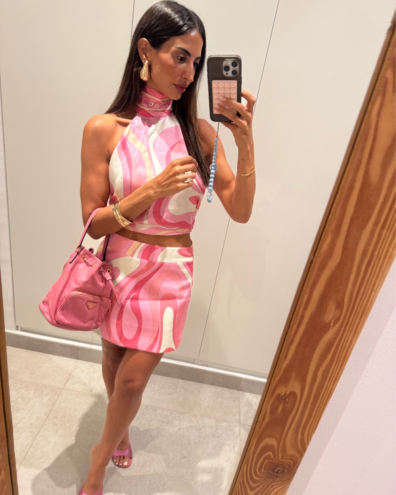 This eye-catching mini set in a bold, swirling pink print is perfect for a fun night out or summer event. The sleeveless, halter-style top and short hemline create a flirty, fashionable look.