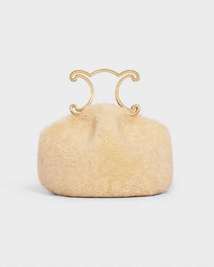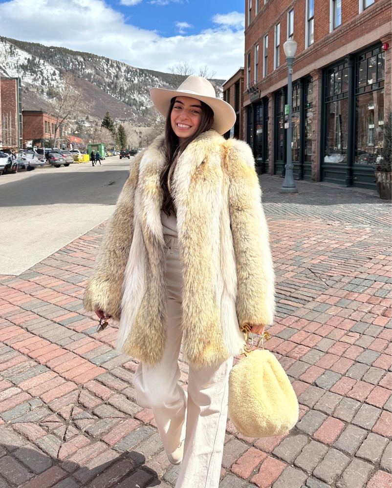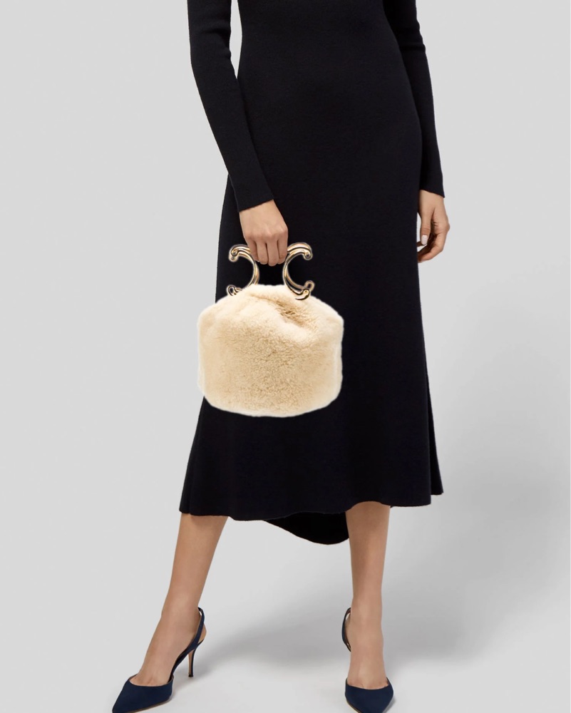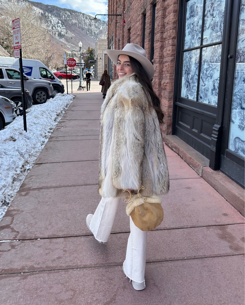 Renting my Celine shearling reversible pouch bag, one side is ivory shearling the other side is brown suede perfect for apres ski trips to Aspen Colorado park city Jackson hole best winter bag Sherpa bag shearling bag