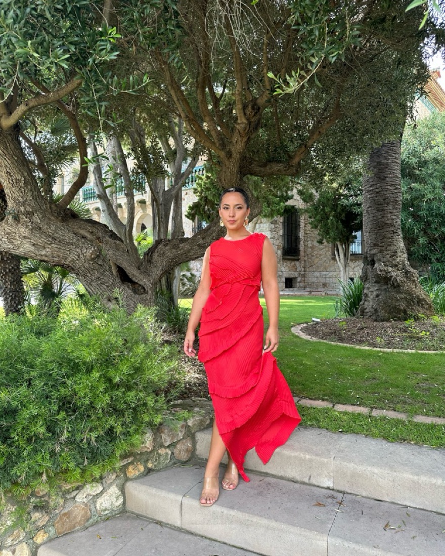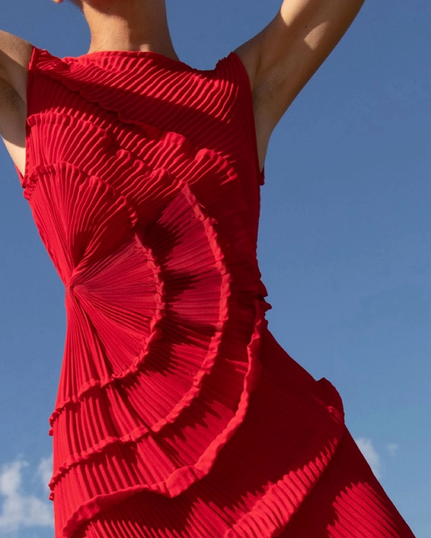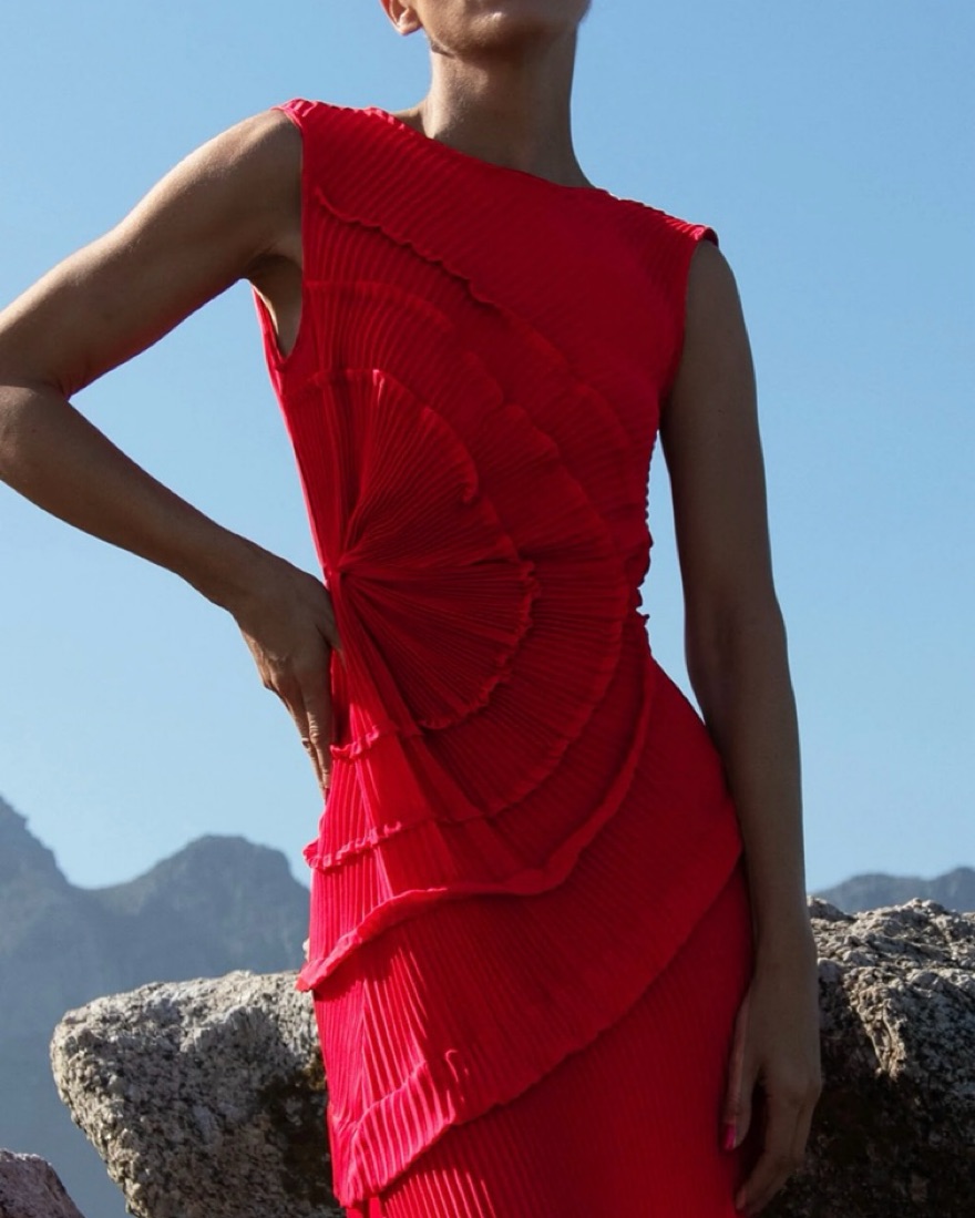 Unique wedding guest dress! Floor Length Dress, pleated all over with statement tucks in a circular motion, flattering the body. Features a gathered panel on the side to nip in and draw focus to the waist. A slit at the side provides ease when worn. The Opal dress has a lot of stretch.